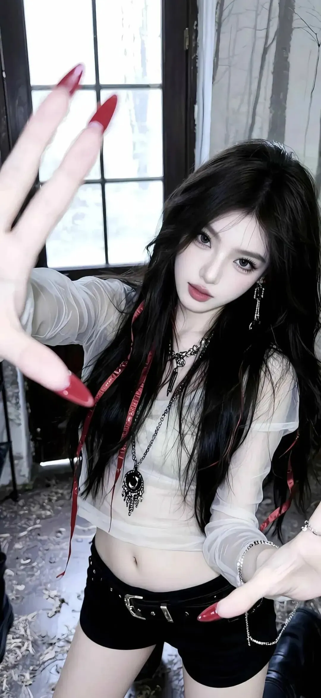 第二组暗黑甜酷风写真,直接把氛围感拉满。雾面白纱上衣搭配黑色短裤,红丝带与红美甲成为点睛之笔,冷调的背景里,每一个细节都在诉说着叛逆与精致。夸张的项链与耳饰强化了风格,伸手的动作带着强烈的镜头感,仿佛下一秒就要从画面里走出来。这种甜与酷的碰撞,是春日里最特别的存在,打破了温柔的刻板印象,展现出女生骨子里的飒爽与张扬。