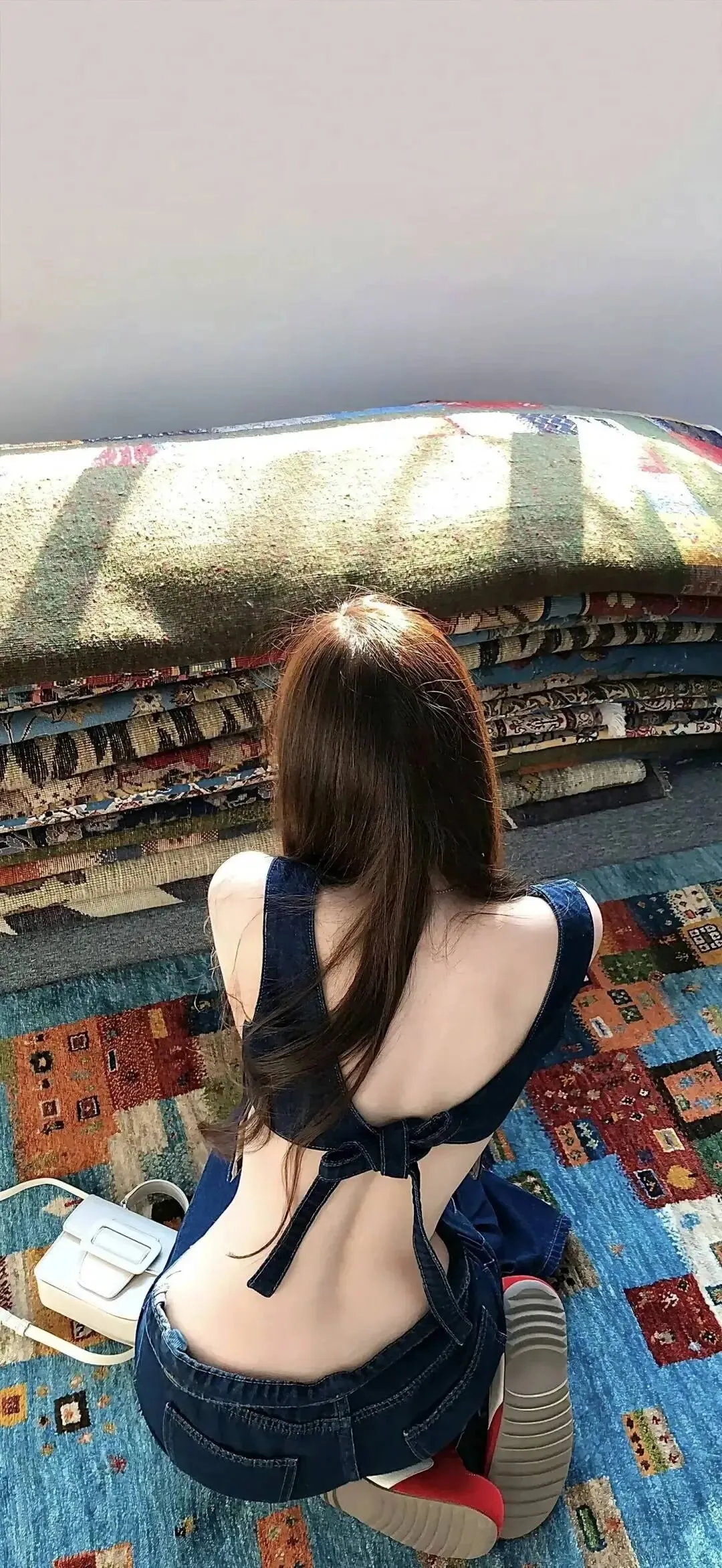最后一组牛仔背杀写真,是慵懒与氛围感的极致体现。复古地毯铺出浓郁的氛围感,牛仔背带裙的露背设计,把背部线条展现得恰到好处,阳光洒在长发与肌肤上,形成温柔的光晕。背影里藏着无限的故事感,仿佛下一秒就会回头,给人一个惊艳的笑容。这种慵懒的松弛感,是春日里最治愈的画面,简单却满是高级感。