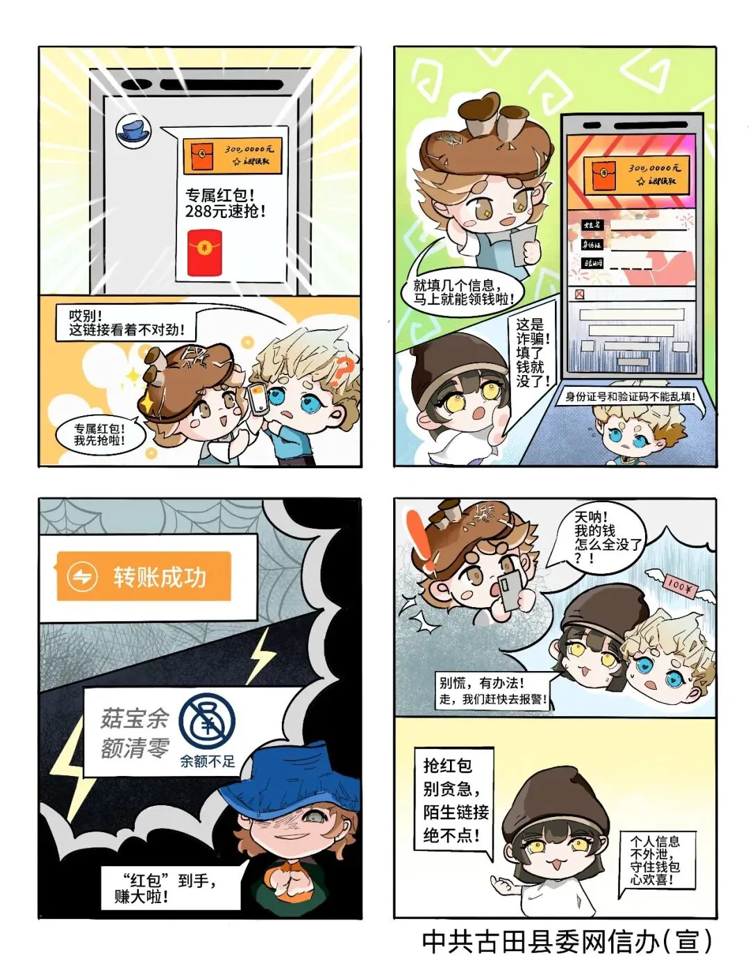 网络普法小漫画之 “红包陷阱” 网络安全小提示:警惕“专属红包”类骗局,真福利不会让你先填信息、先转账,要你输身份证、银行卡、验证码的都是骗!如遇可疑红包链接或发现被骗,立即停止操作,留存证据并报警,通过官方渠道核实情况,守住你的钱袋子! 来源:古田县委网信办 华东政法大学学生团队 编辑:罗 羚 审核:李文君 监制:郑 瑀 总监制:李国镔 投稿邮箱:jrgtb@126.com