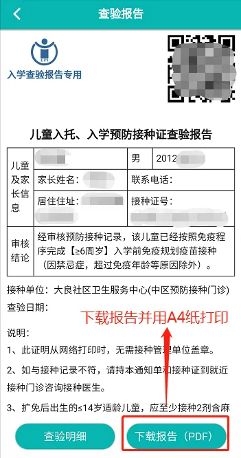 本省适龄儿童办理入学查验:按附件1操作使用粤苗APP,下载并打印《预防接种证查验报告》,交给托育机构/学校,由托育机构/学校保管存档,以备查。