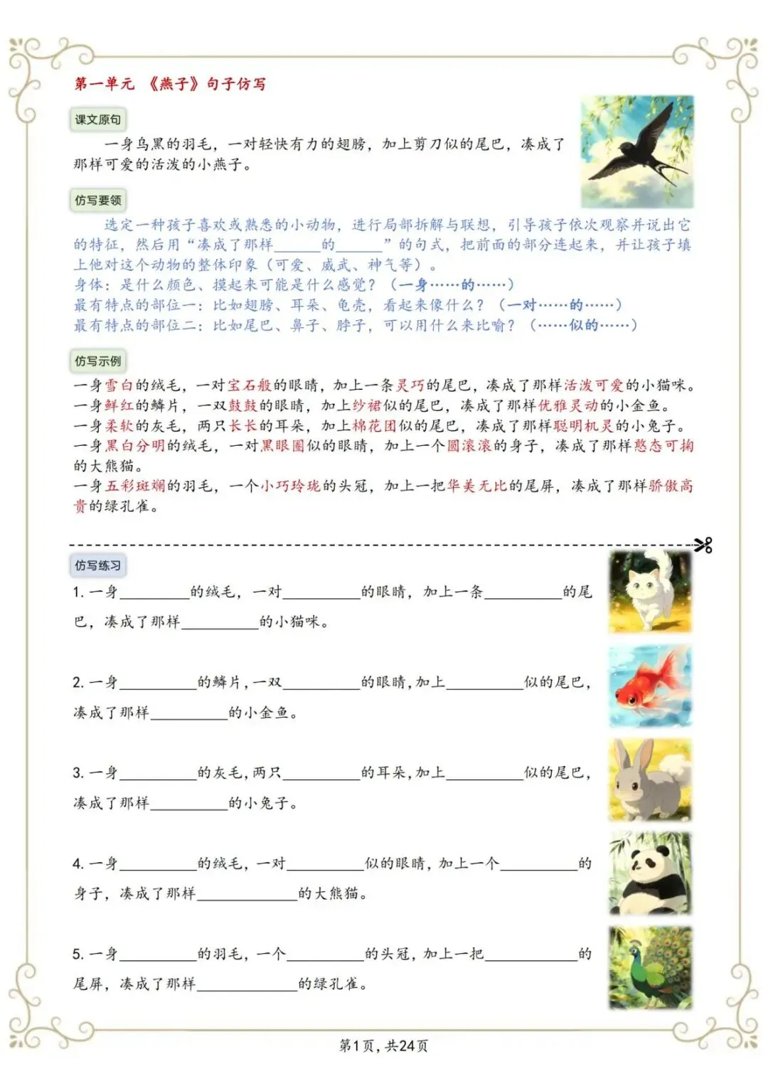 今天给大家分享的是:三年级(下)语文重点句子仿写,共26页,电子版可下载打印。文章末尾可直接领取全套电子版,无套路,欢迎收藏和下载。如果觉得这份资料不错,建议分享到班级群/年级群,让其他家长打印出来,帮助孩子学习;如果觉得合适,请支持正版!