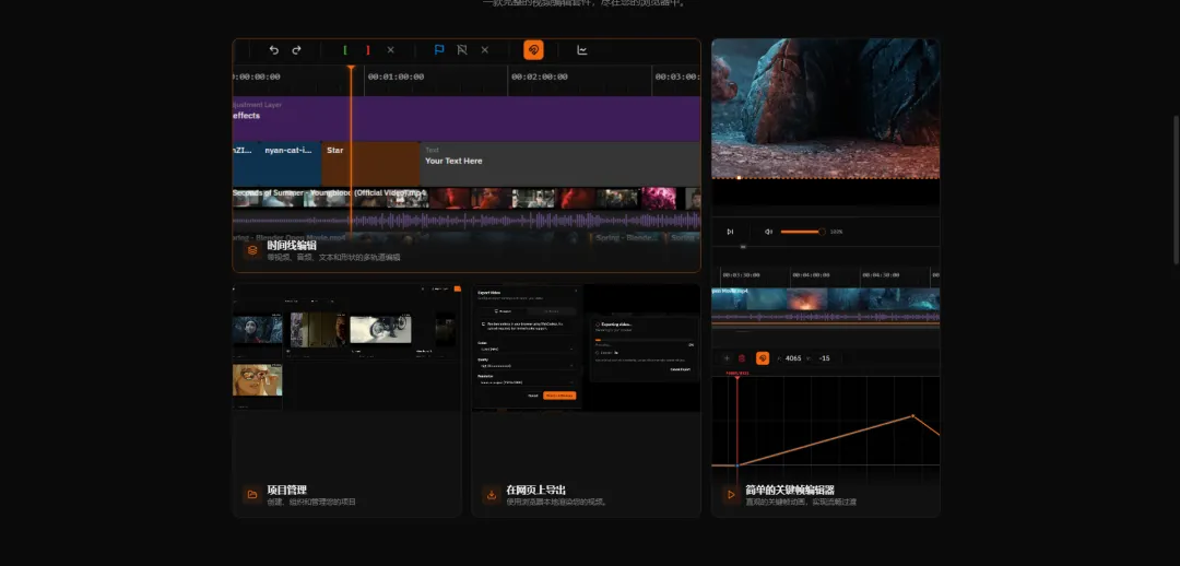 它的视觉特效主要走 WebGPU。自带的能力包括模糊、调色、扭曲、风格化、抠像,以及 25 种 GPU 加速混合模式;关键帧部分则支持贝塞尔曲线、spring 缓动、Graph Editor、Dopesheet 和 Auto-keyframe。换句话说,FreeCut 不是只能做“拼接 + 导出”,而是能覆盖一部分常见的短视频包装需求。