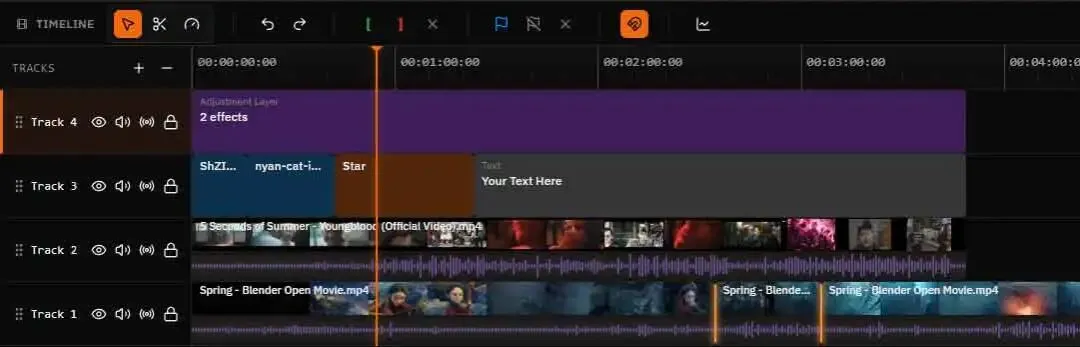 FreeCut 的时间线能力比很多人预期要完整。它支持视频、音频、文字、图片甚至图形的多轨混剪,带轨道分组、静音、可见、锁定联动,也有 Trim、Split、Join、Ripple Delete、Rate Stretch、Rolling Edit、Slip、Slide 这些常见的精剪工具。对于一款浏览器工具来说,这已经不是“玩具级”配置。