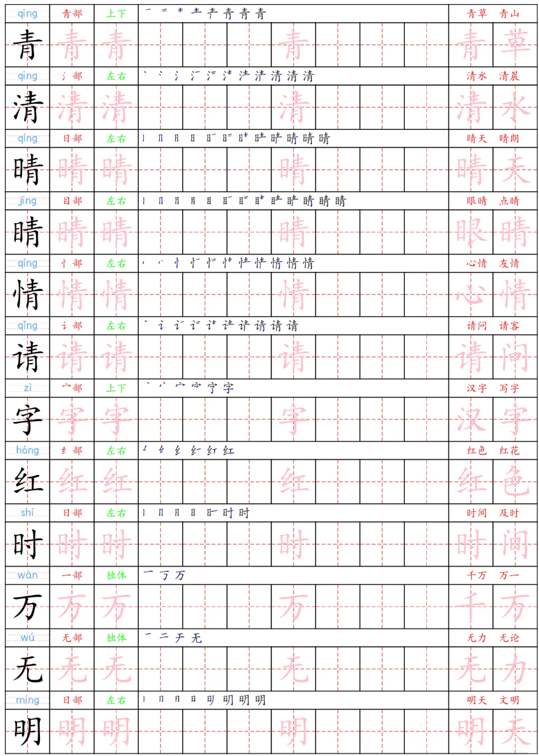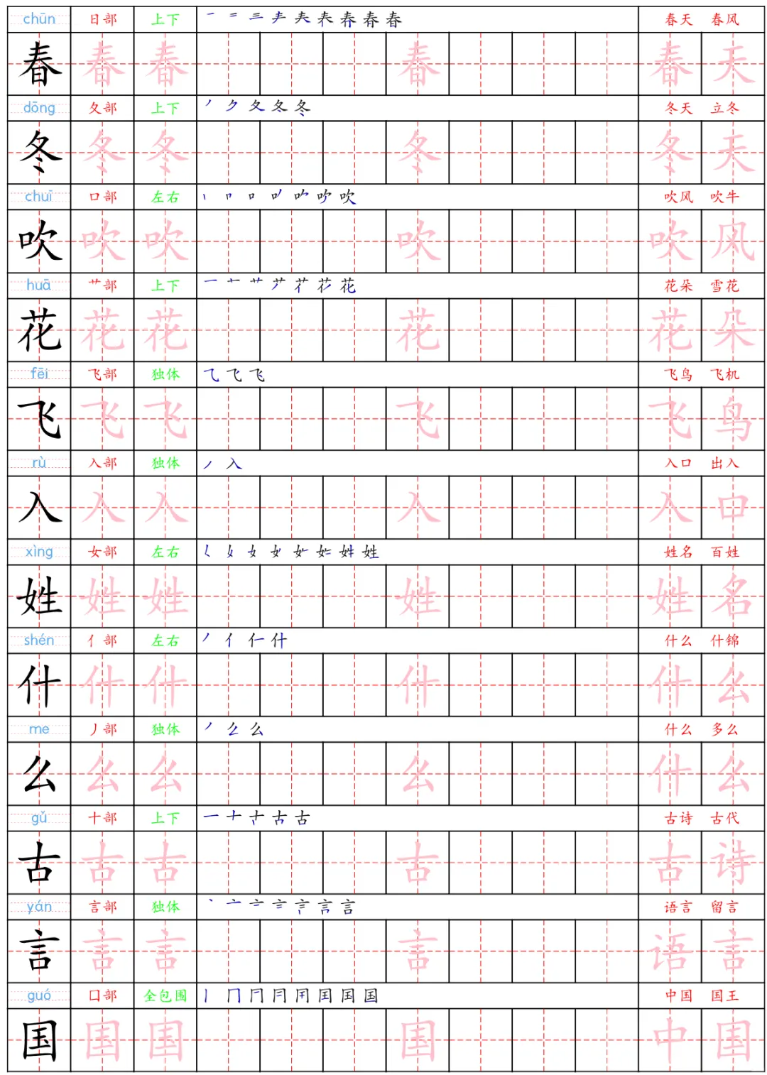 一年级下语文生字练字贴,PDF电子版,可下载打印