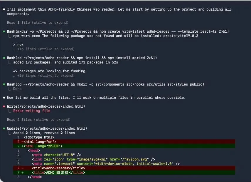 比如它问我使用场景、技术栈偏好,还有要加哪些ADHD友好特性,这块我选了仿生阅读,就是加粗每个单词前几个字母,一个比较经典的缓解ADHD的方法。