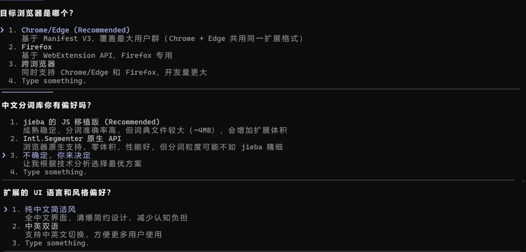 我选了浏览器扩展,然后它又问了核心功能,到这一步的时候,我看着这些选项愣了一下,因为我自己也没那么熟,所以我说直接我都不是很了解,你去给我查一查吧。