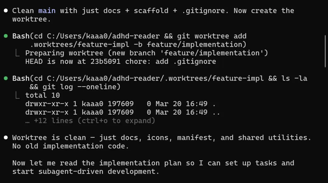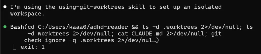 但这个时候,第二个skill开始接入,用using-git-worktrees这个Skill,创建了一个隔离的工作区。