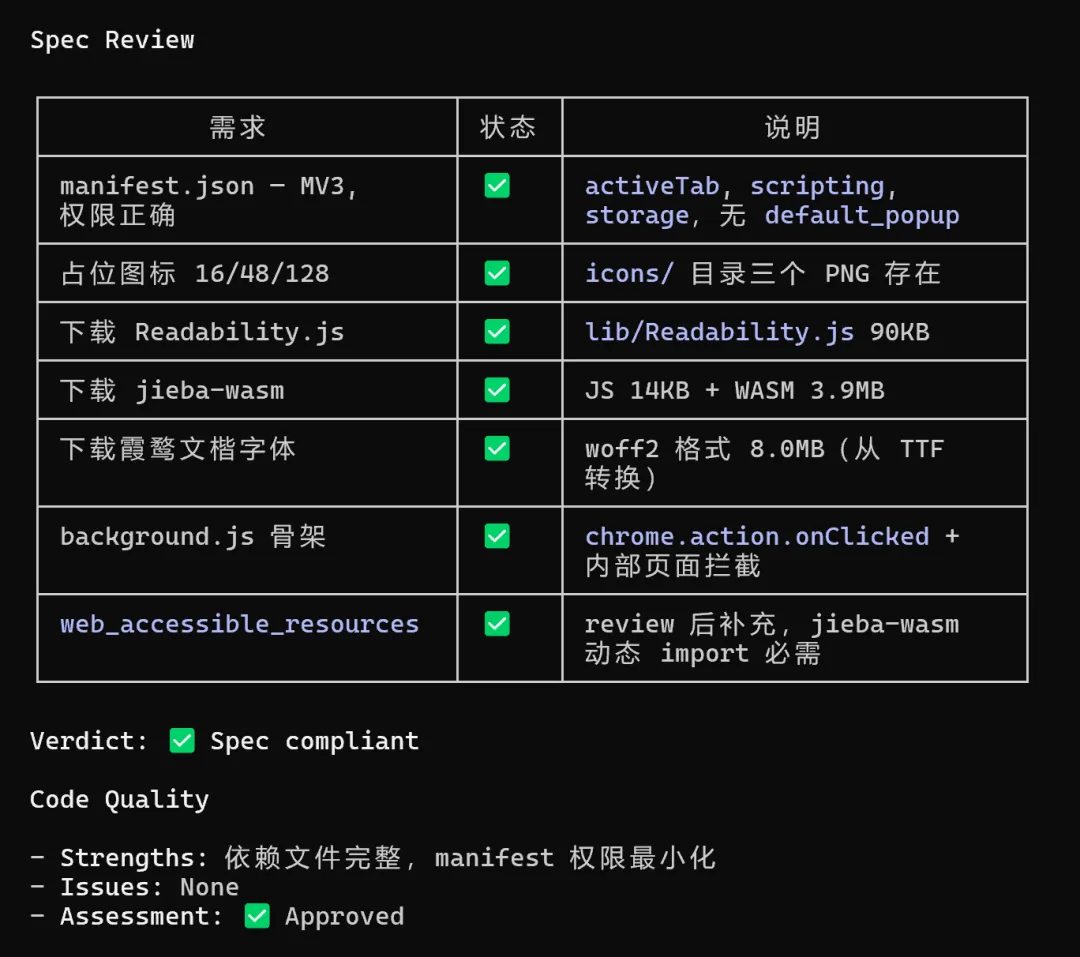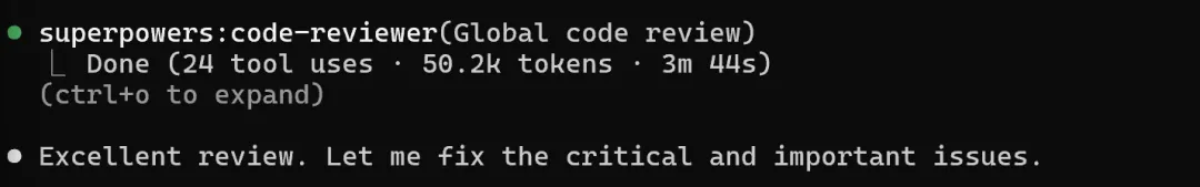 这10个小任务,终于开发完了,审查还没完,下一个环节,requesting-code-review这个skill会派一个最终审查Agent出来,把所有代码从头到尾通看一遍。