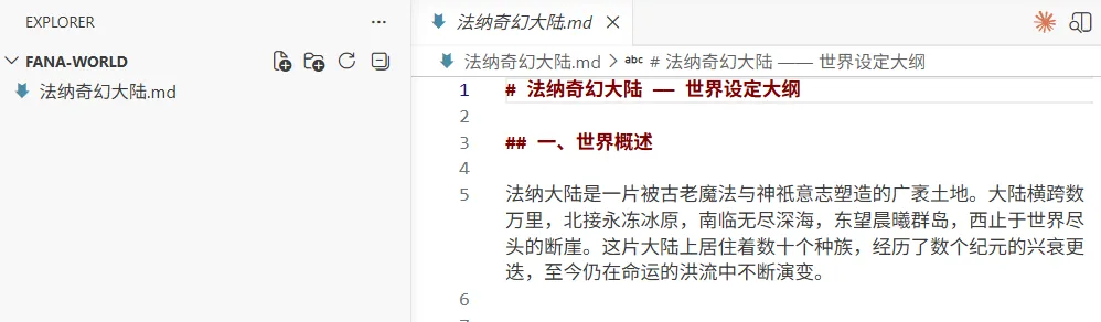 AI Coding CLI 生成了一篇主文档 法纳奇幻大陆.md,包含 10 个板块:世界概述、创世神话、纪元划分、地理与区域、种族设定、魔法体系、势力与阵营、核心冲突、基调与主题,以及一份待扩展清单。每个板块有简短的概述和关键设定点。