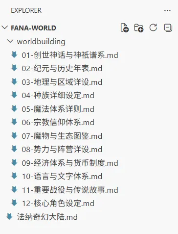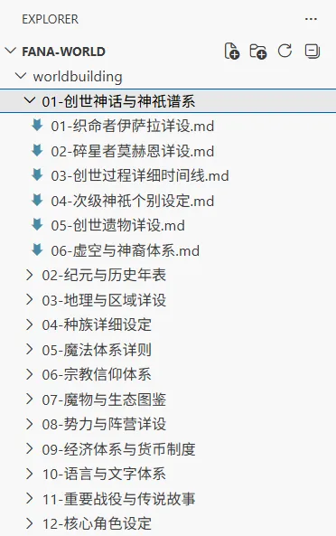 AI Coding CLI 创建了 12 个子目录,编写了 48 篇子文档。每篇文档深入一个世界设定的特定方面。例如”创世神话与神祇谱系”这个分类下,展开了织命者伊萨拉详设、碎星者莫赫恩详设、创世过程时间线、次级神祇设定、创世遗物详设、虚空与神裔体系共 6 篇子文档。