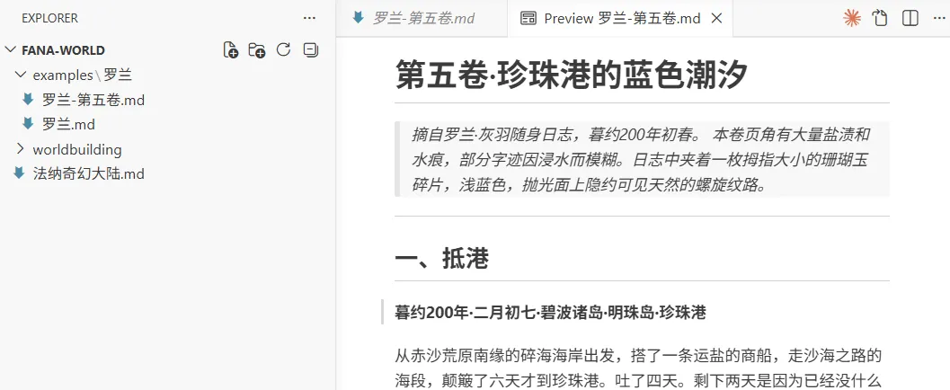 第三步:单卷深度展开。 我选定了其中第五卷(珍珠港·海族),要求展开为完整的独立文档。AI 重新阅读了海族设定、碧波诸岛地理、灵脉系统和经济体系等关联文档,将约 800 字的日志扩展为十一章、约 7,000 字的中篇叙事。新增的所有细节——海族的双栖变形过程、珊瑚湾的灵脉涌泉、棘背海马的灵脉脉冲、歌鲸的远距声纳——都能在世界设定文档中找到对应的来源。