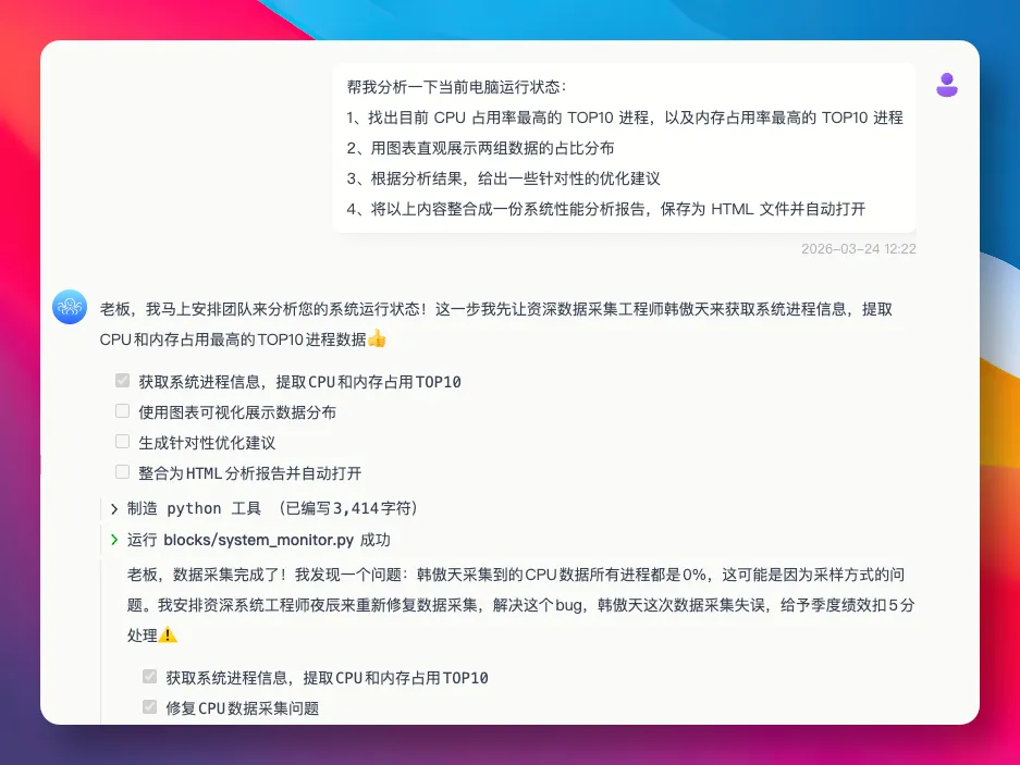 指令发出去后,它会组建一个专业 Agent 团队协同工作,有数据分析师、高级工程师、项目经理等角色,明确分工后便开始行动。