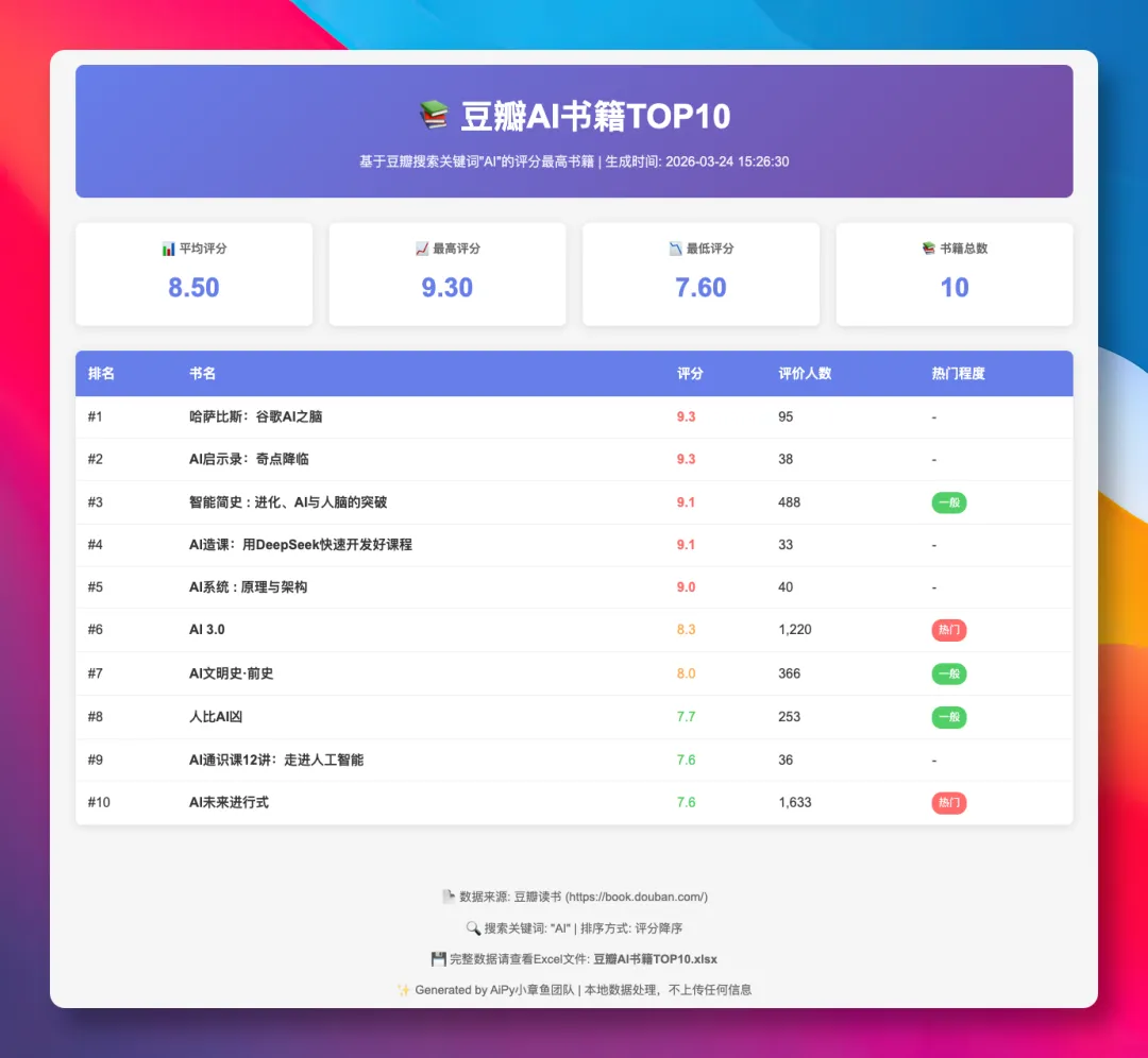 打开豆瓣读书,搜索关键词「AI」,找出评分最高的 10 本书,保存到 Excel。