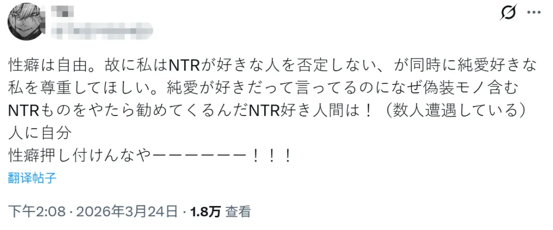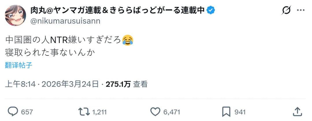 日本X漫画家@肉丸发帖吐槽中文圈讨厌NTR,结果中日网友都表示不能接受被绿!