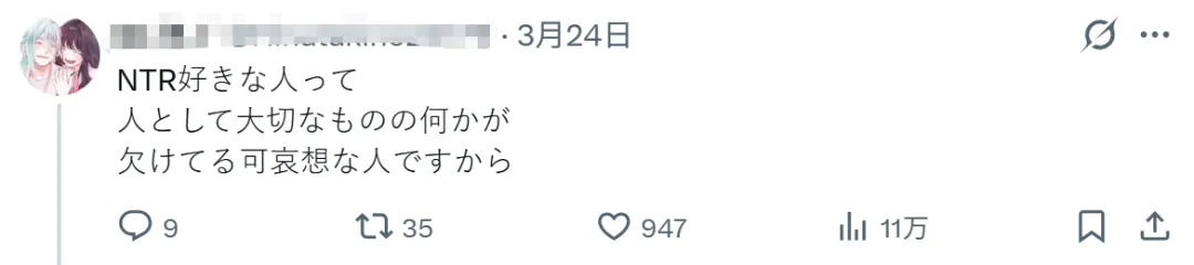 还有人表示在其他国家看来,日本好像也太喜欢NTR了,在日本,NTR是成熟的商业类型,深受一部分受众喜爱,被视为刺激神经的重口味调味剂。