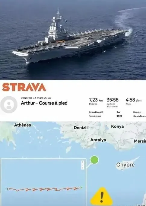 世界真是一个巨大的草台班子。2026年3月13日,法国 “戴高乐” 号核动力航母一名军官在甲板跑步,使用Strava跑步APP记录运动轨迹,数据上传后竟然设置为公开,航空母舰GPS数据全网可见,让跑步APP成为“间谍”,媒体记者很快就定位到了“夏尔·戴高乐”号航空母舰的行动轨迹,引起法国国内政局震动。