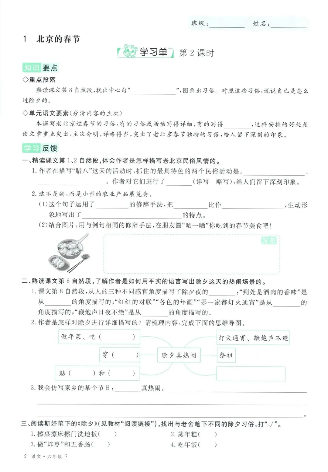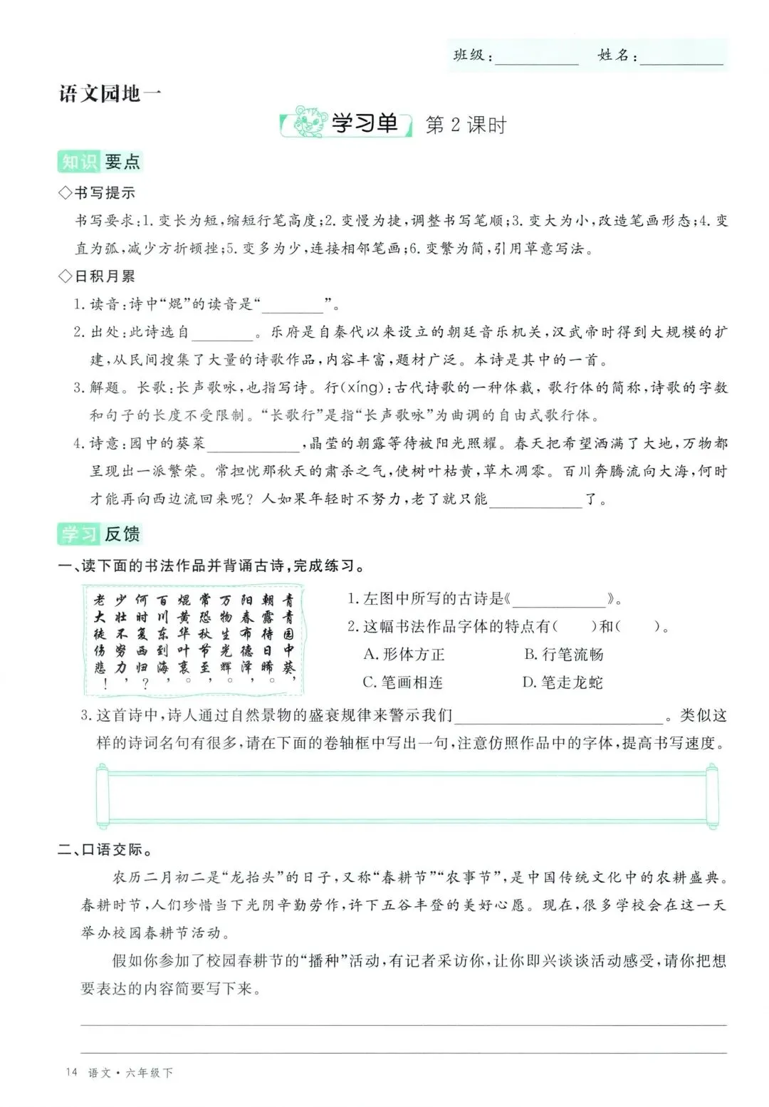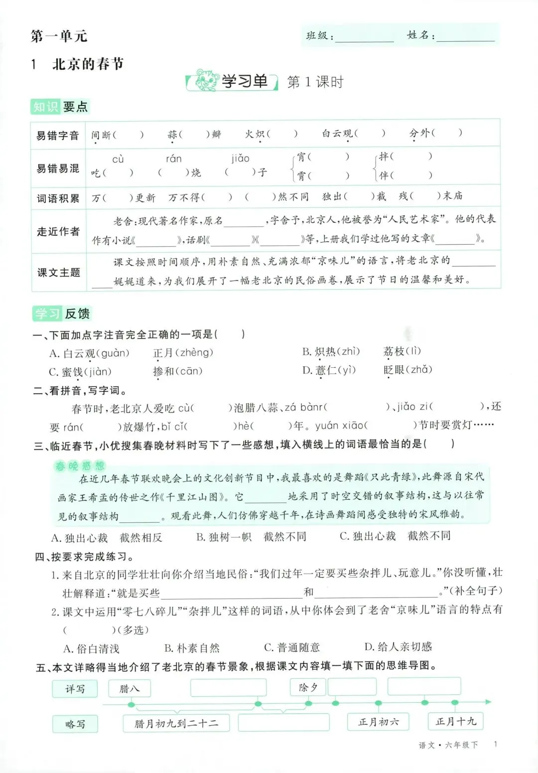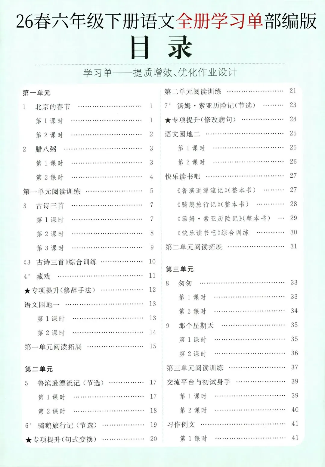 26年春新版六年级下册语文部编版全册学习单,有完整电子版可打印