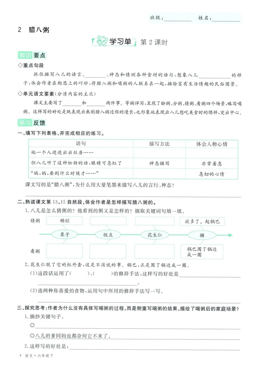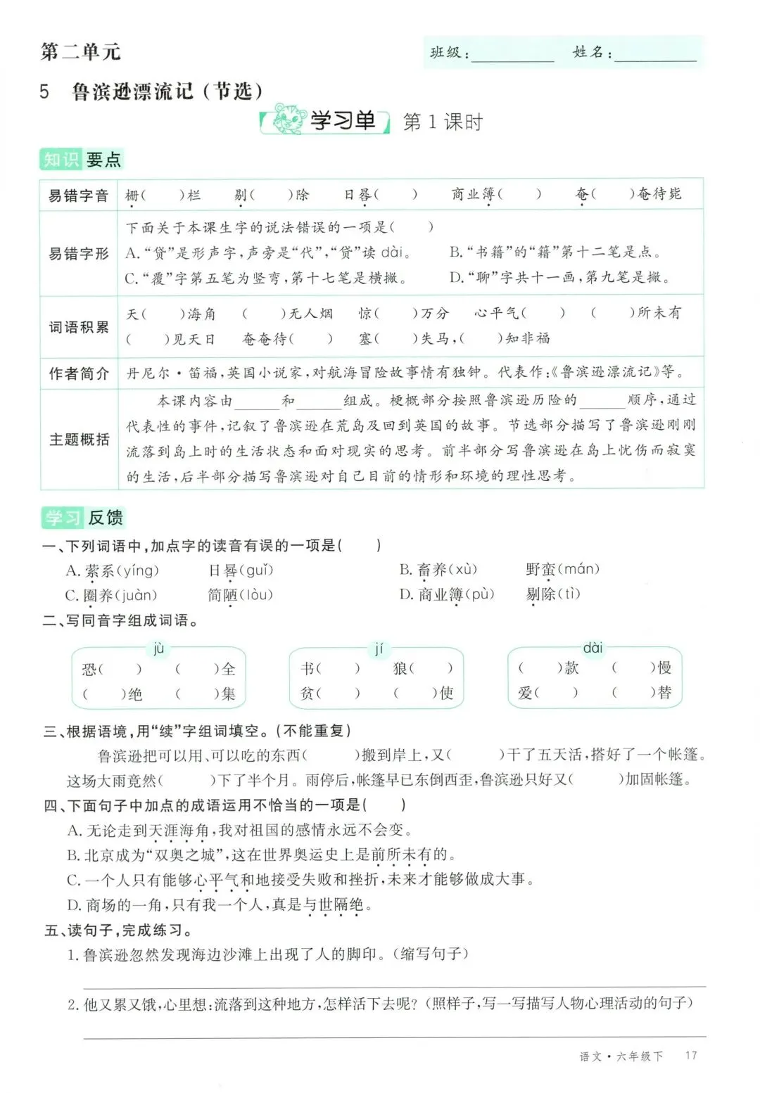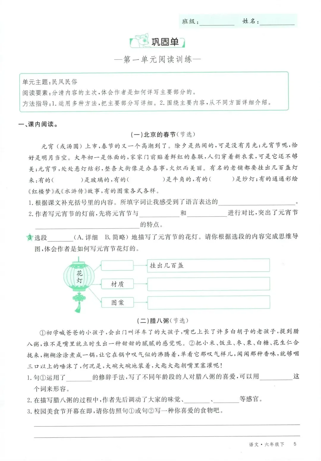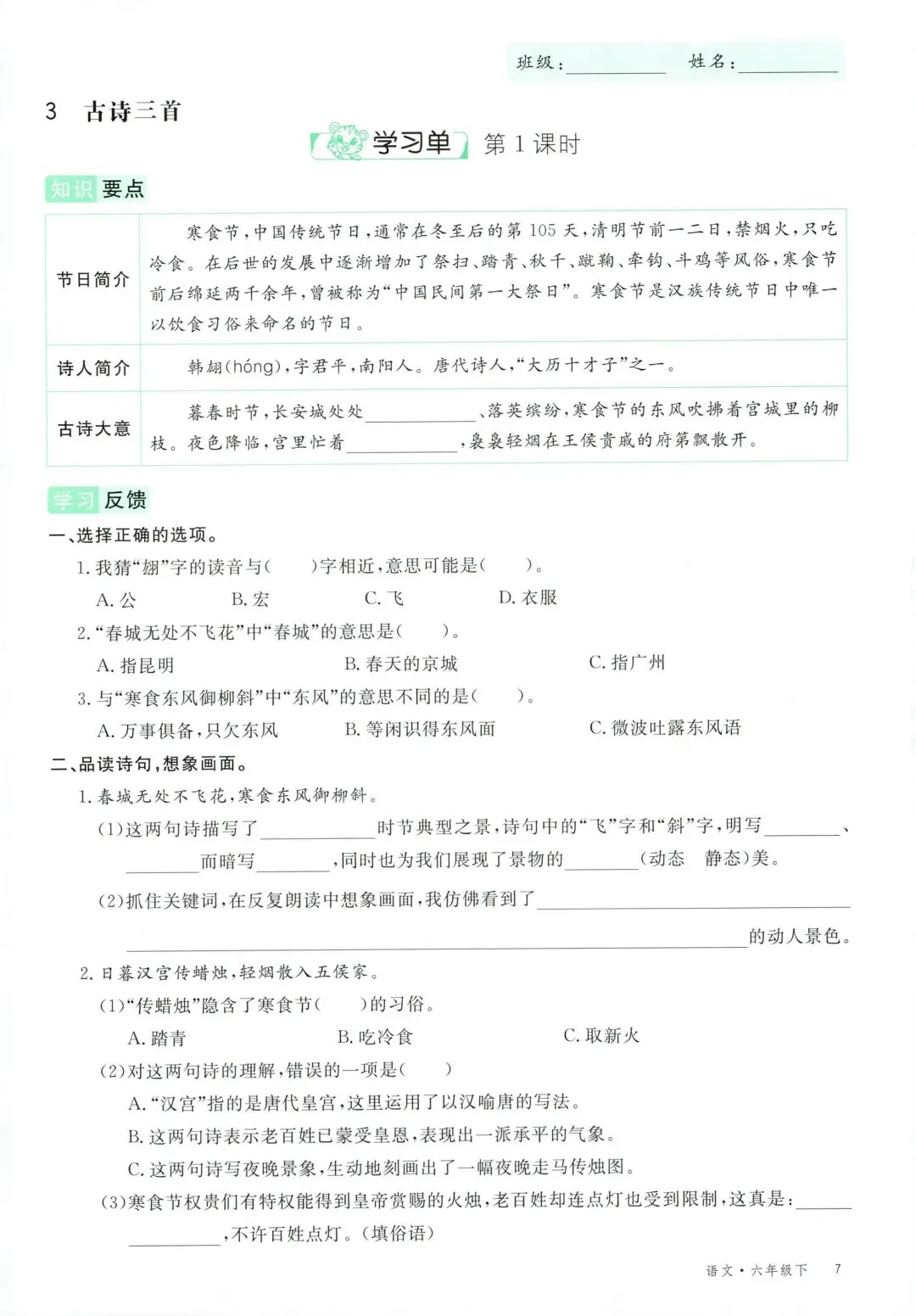 26年春新版六年级下册语文部编版全册学习单,有完整电子版可打印