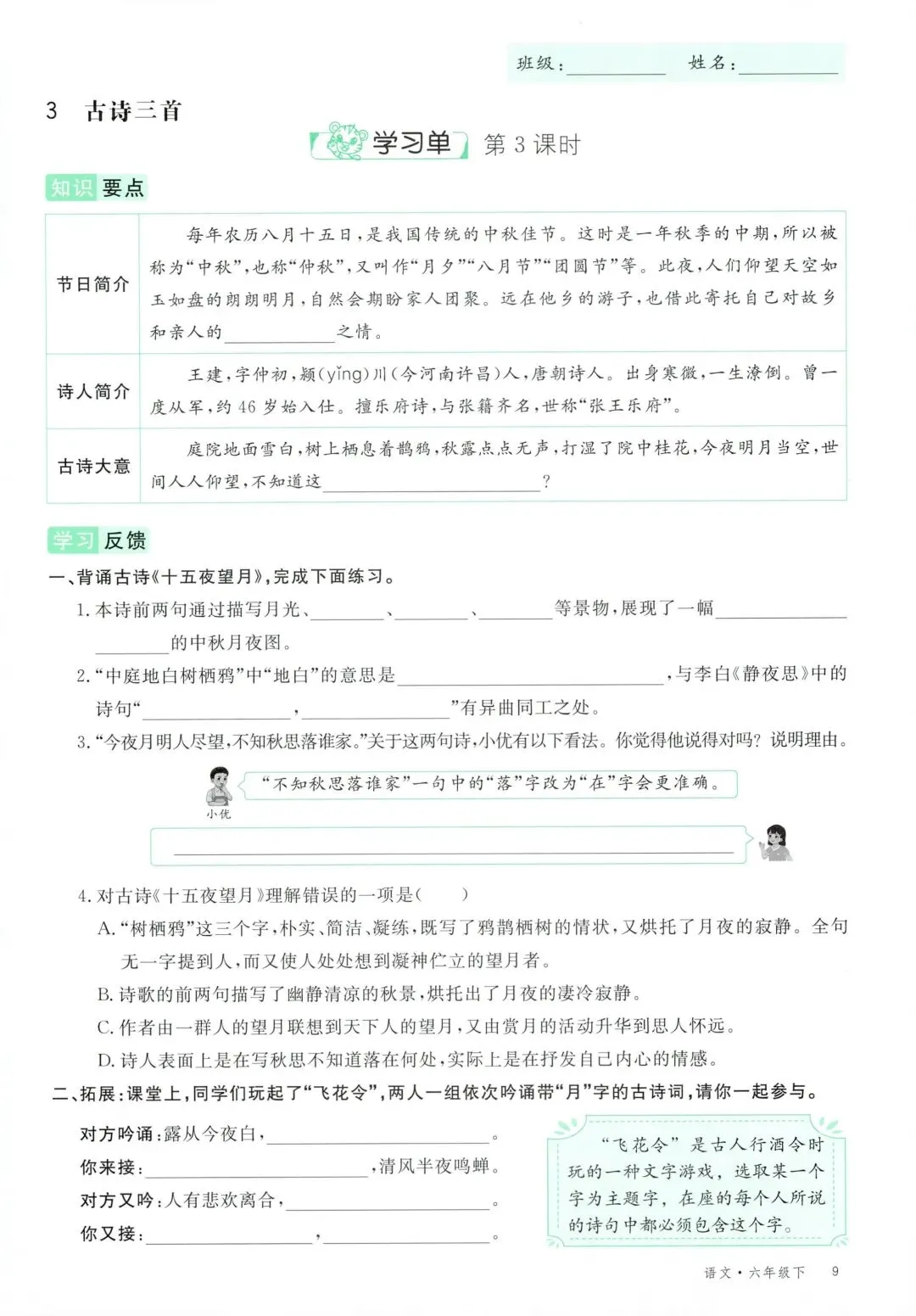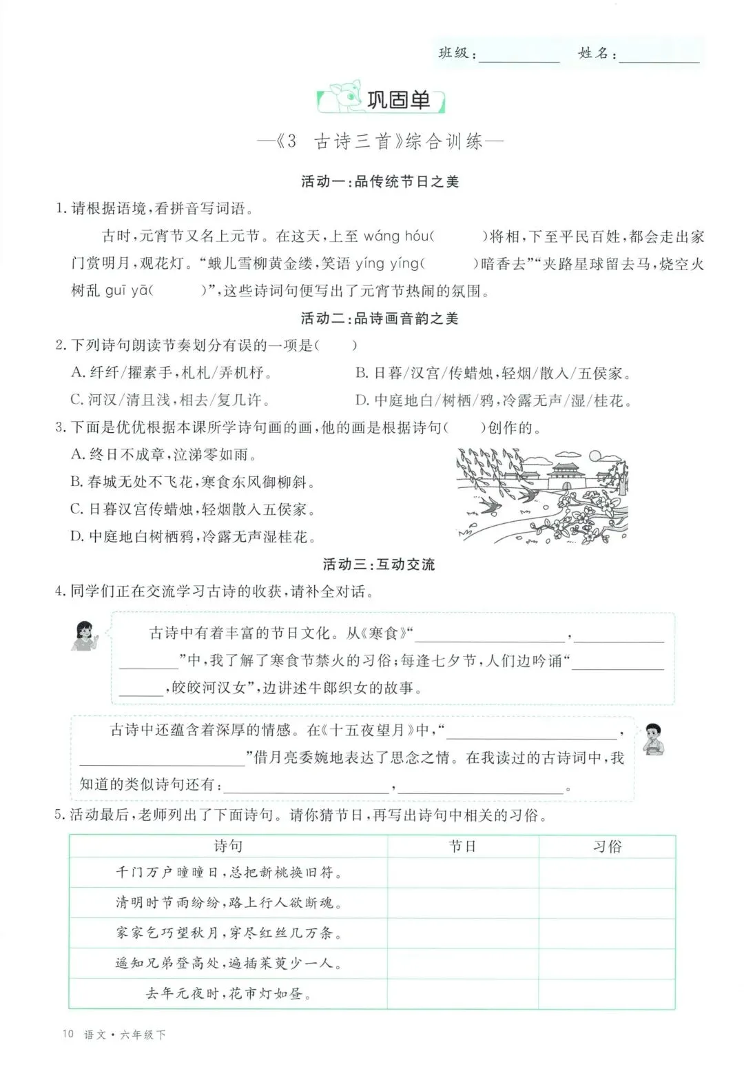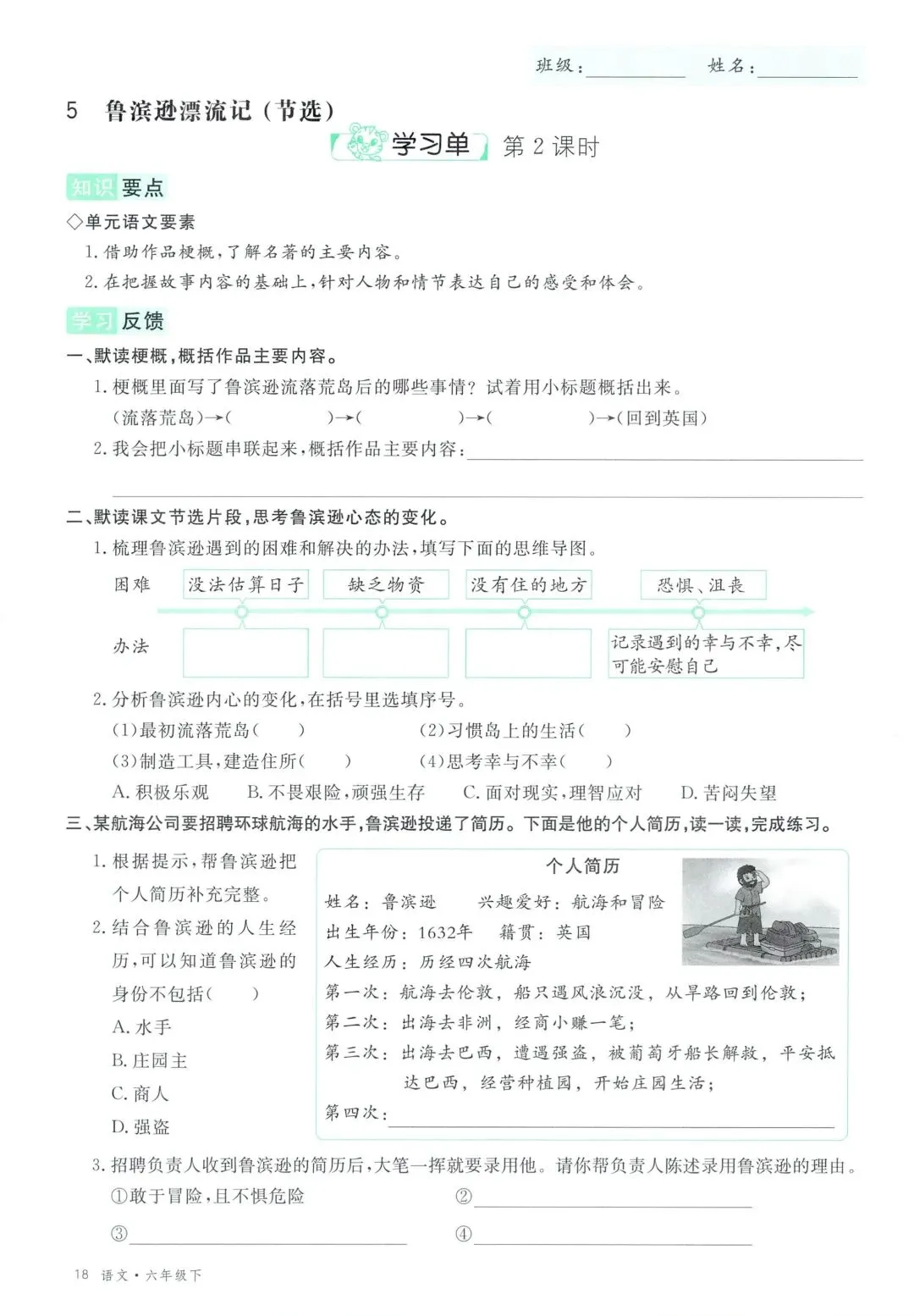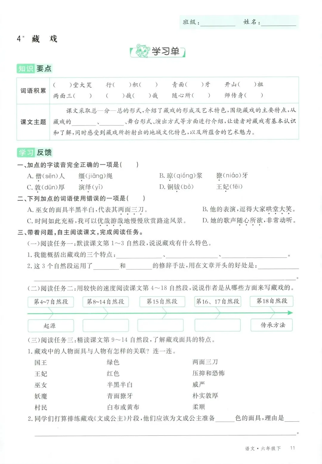 26年春新版六年级下册语文部编版全册学习单,有完整电子版可打印