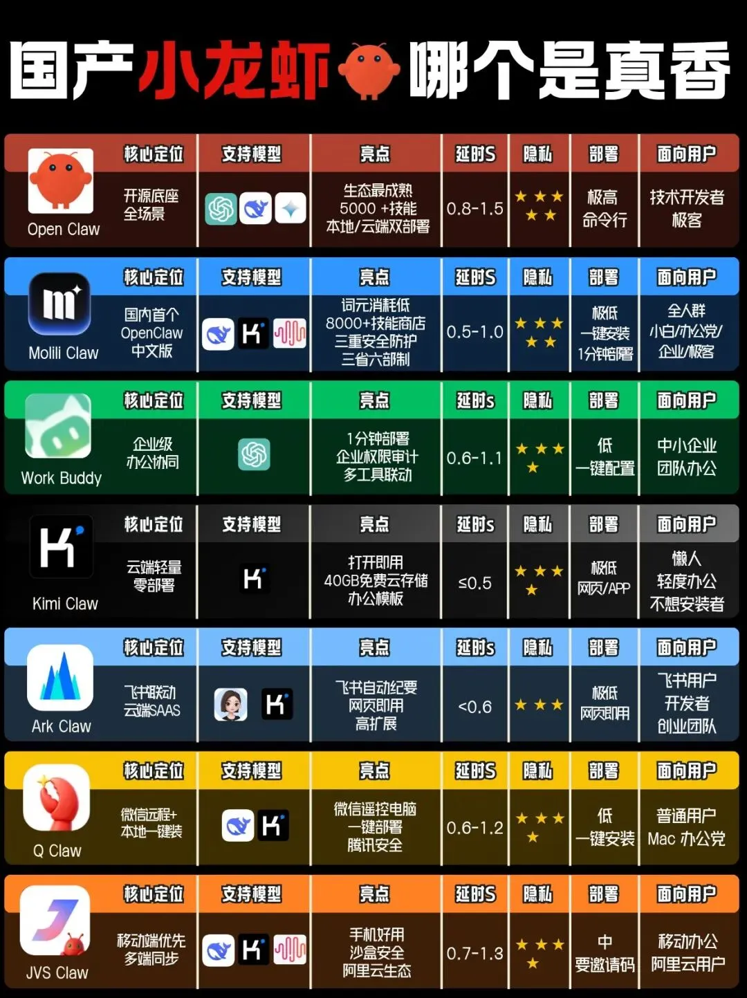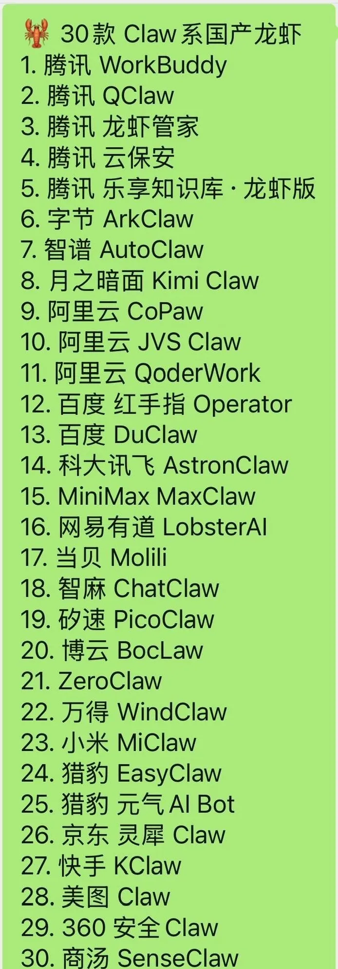我整理了30款”Claw系”国产龙虾的名单,阵容堪称豪华。腾讯系就有WorkBuddy、QClaw、龙虾管家等5款产品;字节、阿里、百度、科大讯飞、MiniMax、月之暗面等厂商也各自推出了ArkClaw、CoPaw、DuClaw、Kimi Claw等”claw”产品。