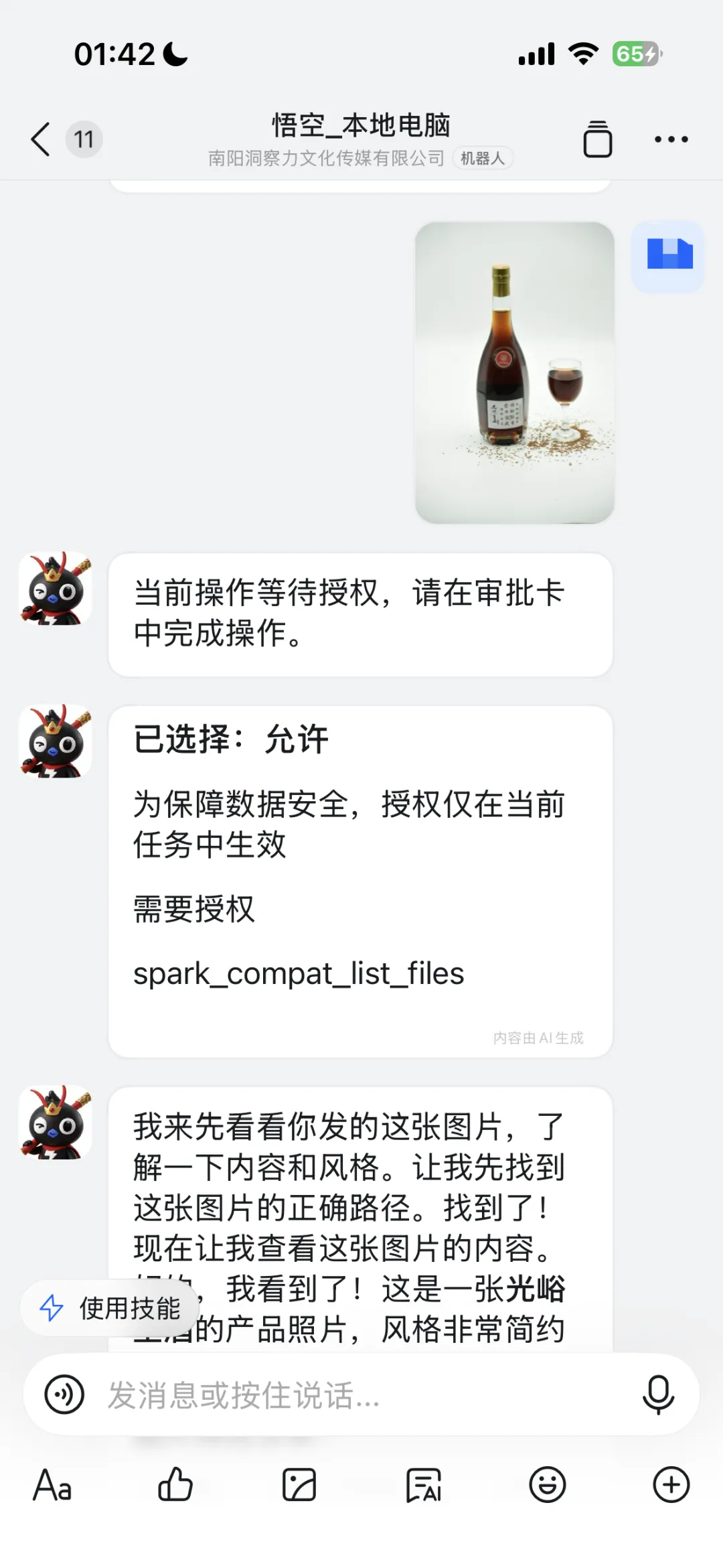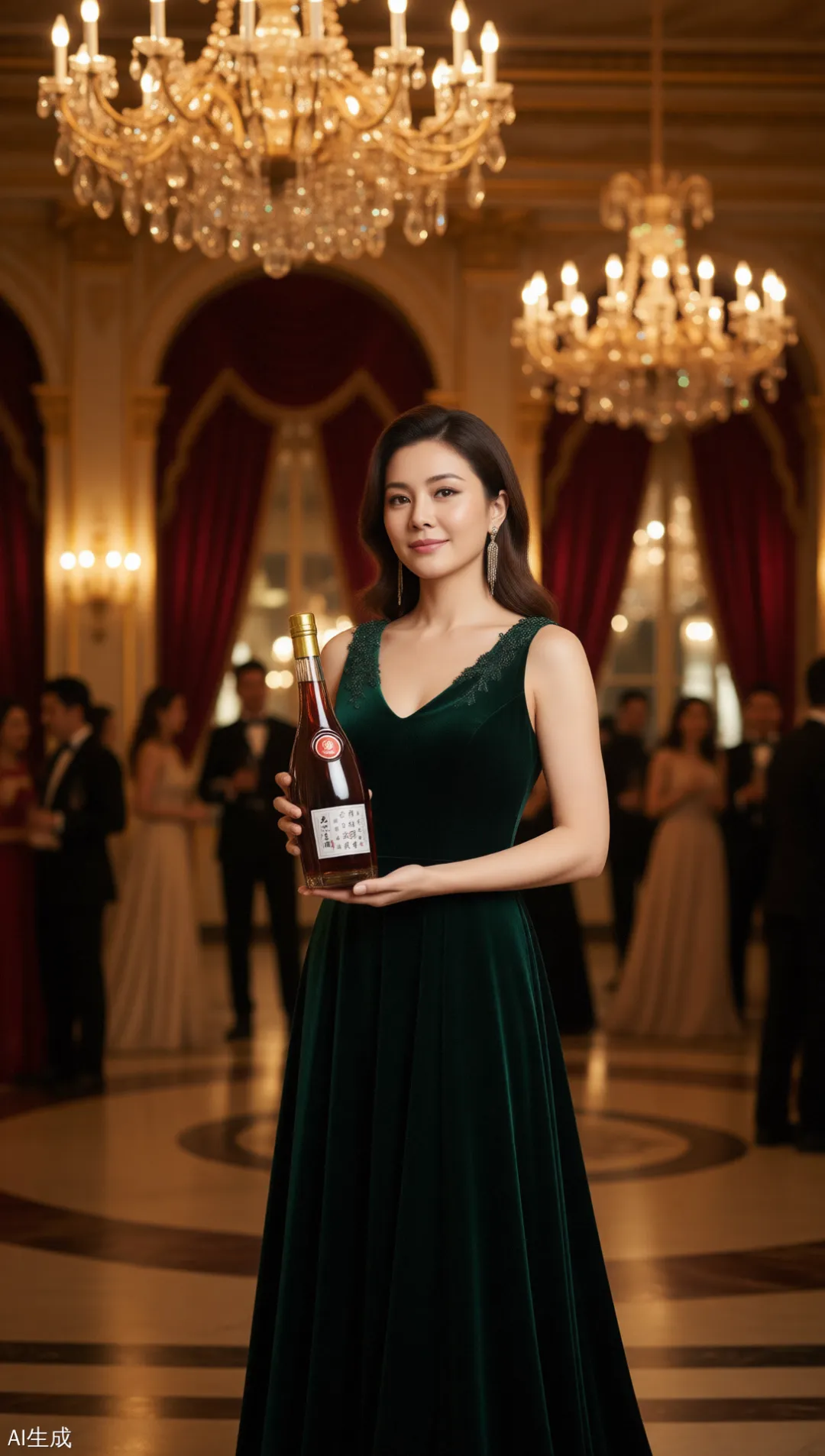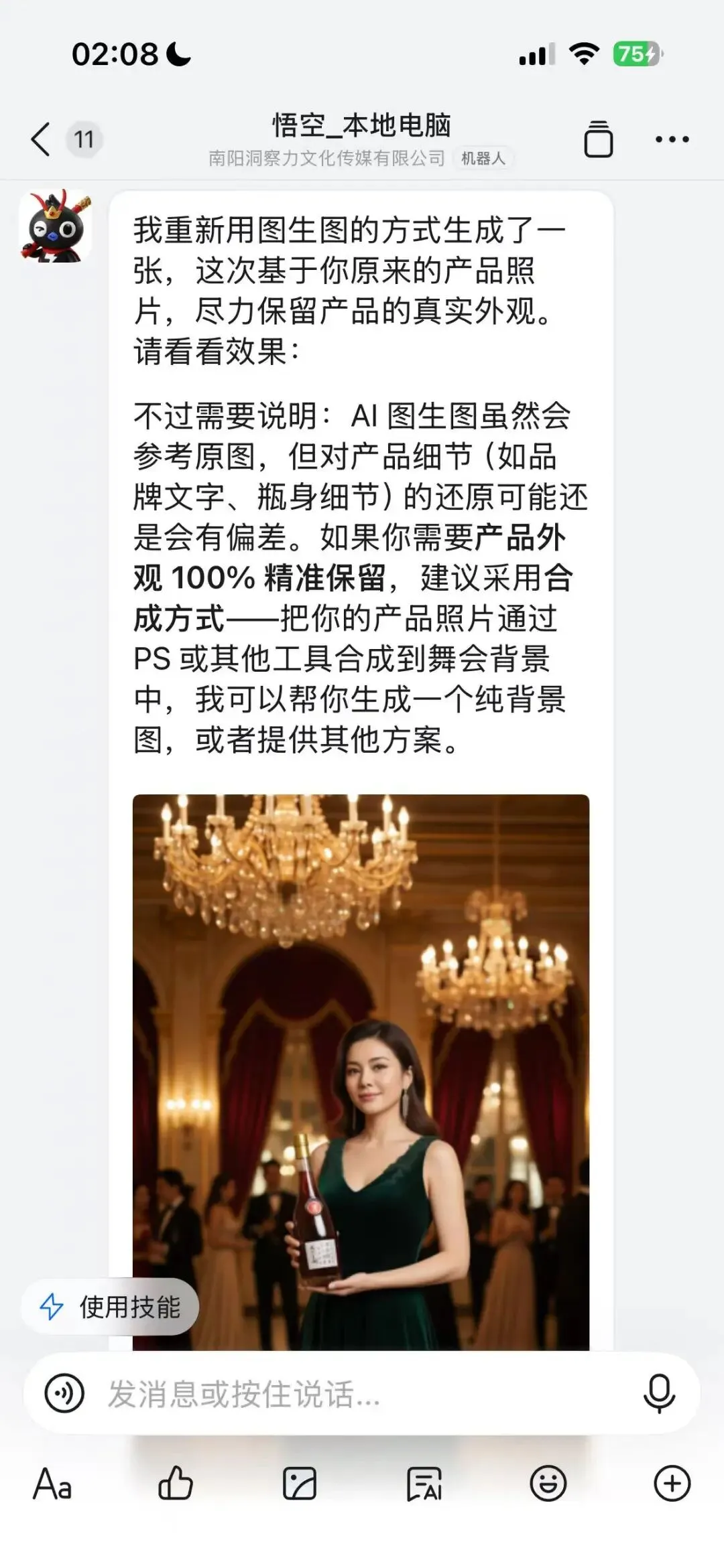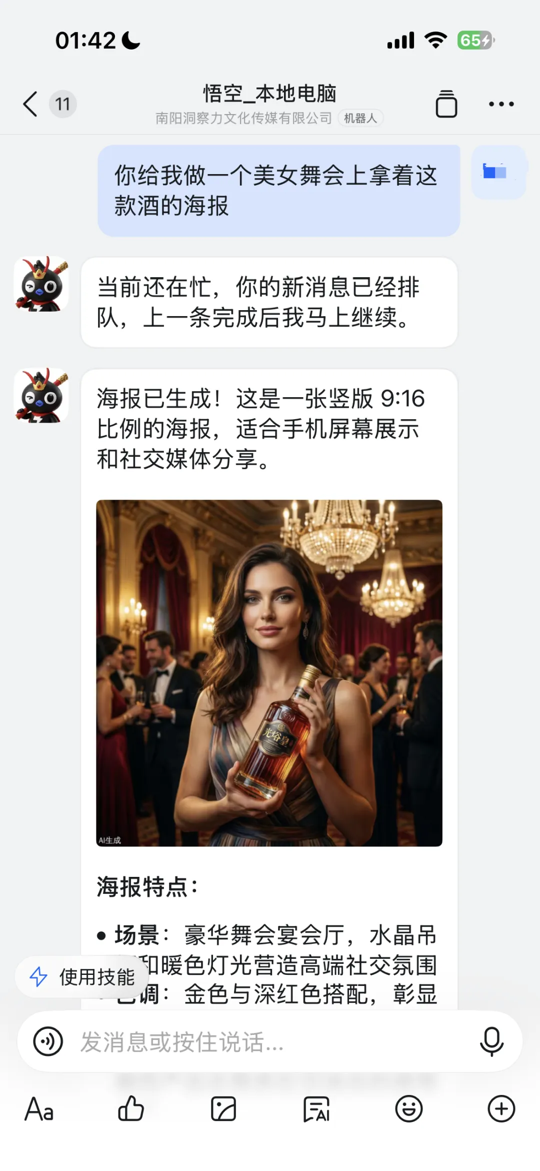 电商和标品行业老板最关心的自动生图(文生图和图生图)或是视频功能,我做了测试,图生图:给了悟空一张标品的产品白底图,让他给我生成一个美女拿着酒瓶在舞会上的海报。