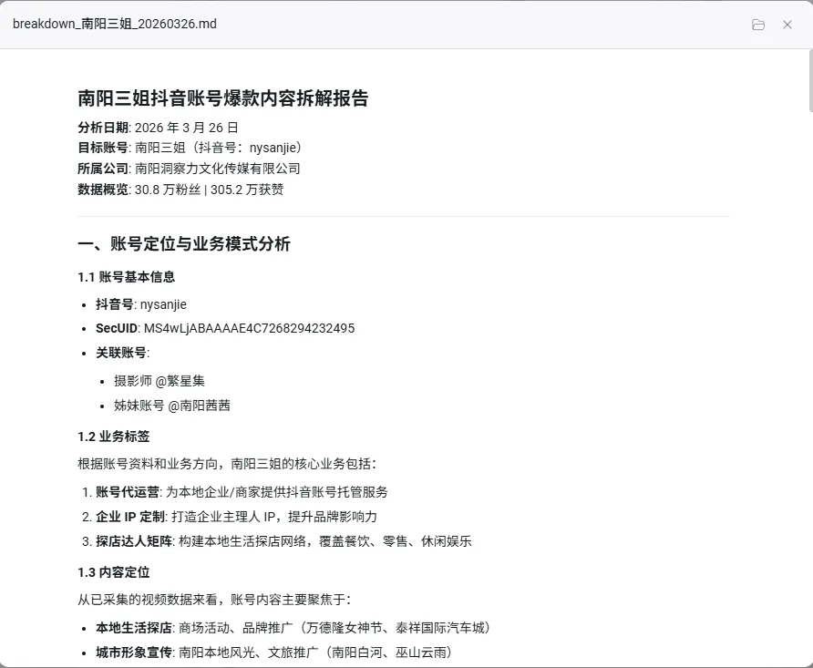 我让悟空拆解南阳三姐的爆款视频,给出报告: