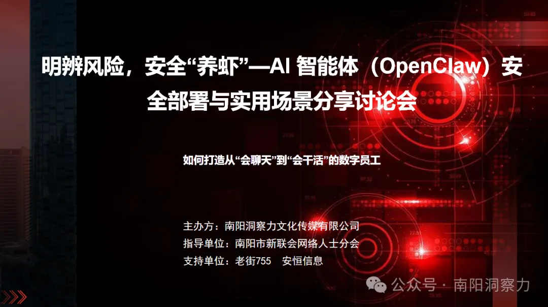 这个月的3月13日,OpenClaw安全部署与实用场景分享会议在南阳老街755A馆民营企业学习中心也是圆满落幕。这场以“明辨风险,安全‘养虾’”为核心的技术交流盛宴,成为南阳本土AI技术力量与国内顶尖安全厂商深度联动的重要契机。