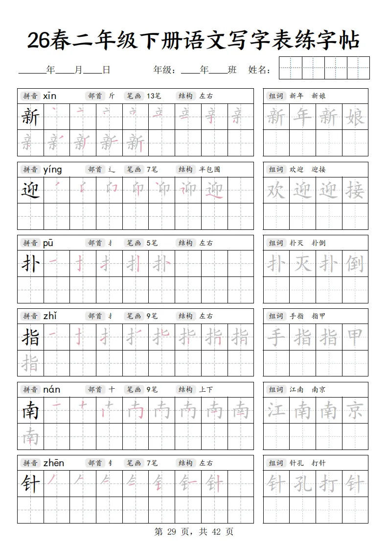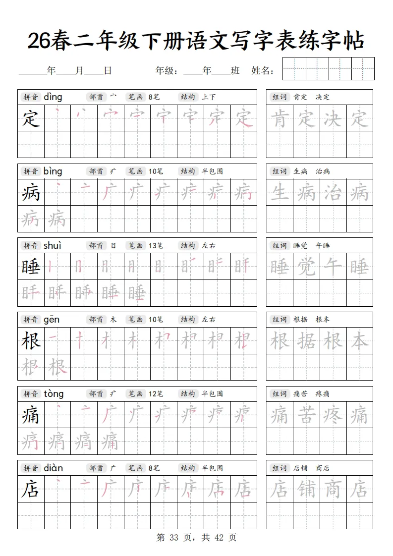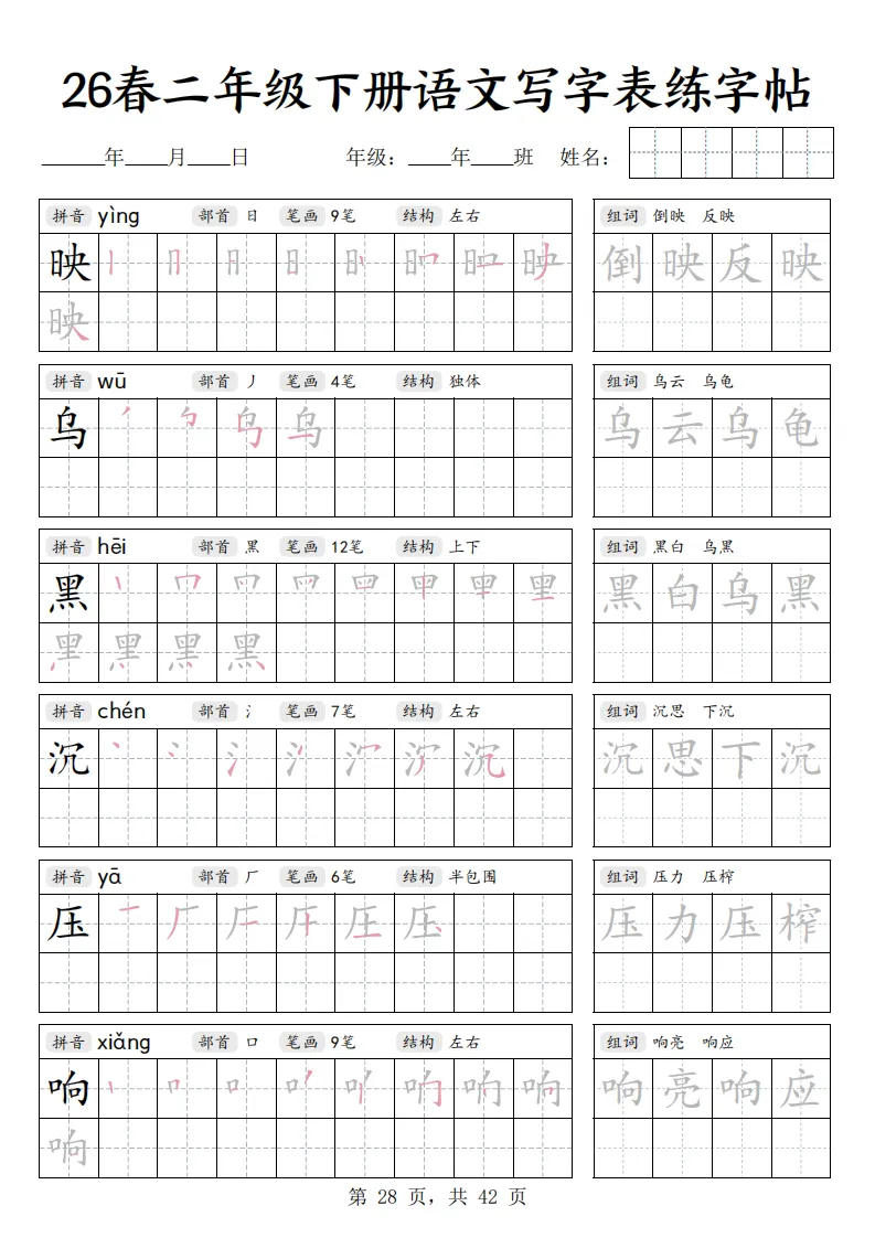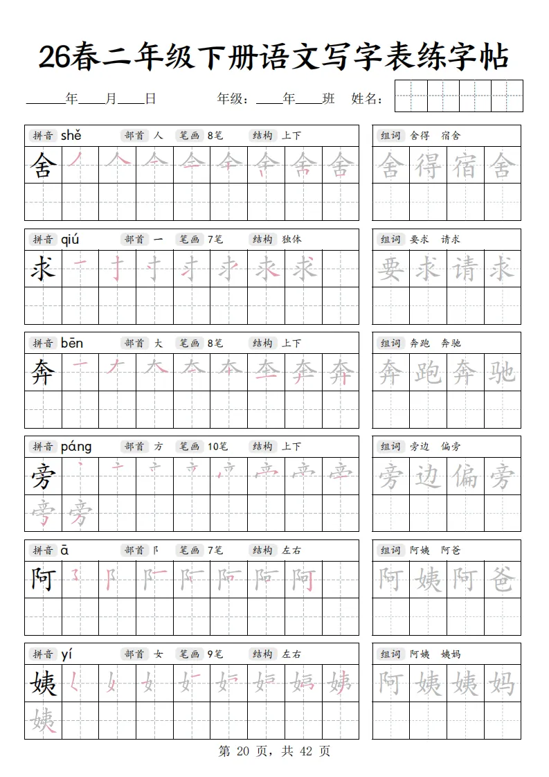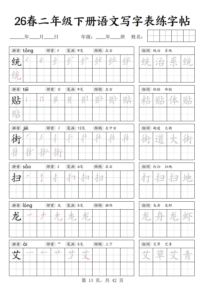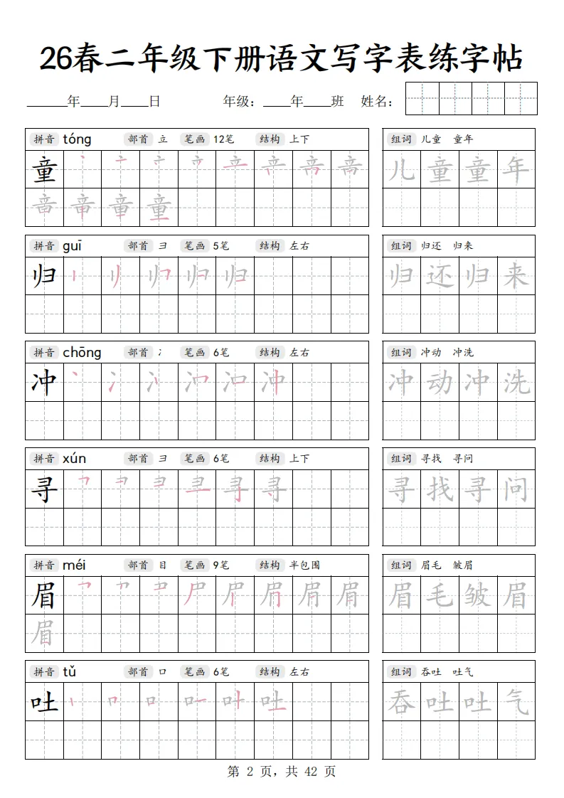 26春二年级下册语文《写字表练字帖》|电子版可打印