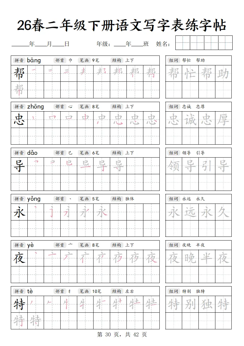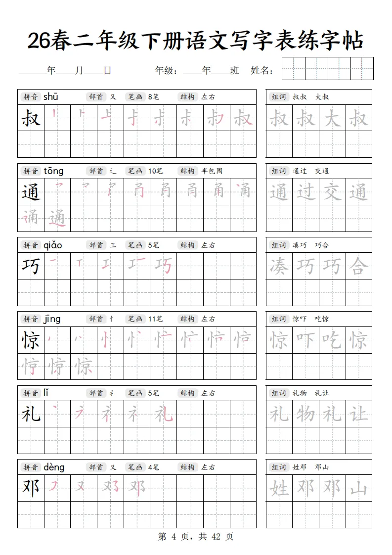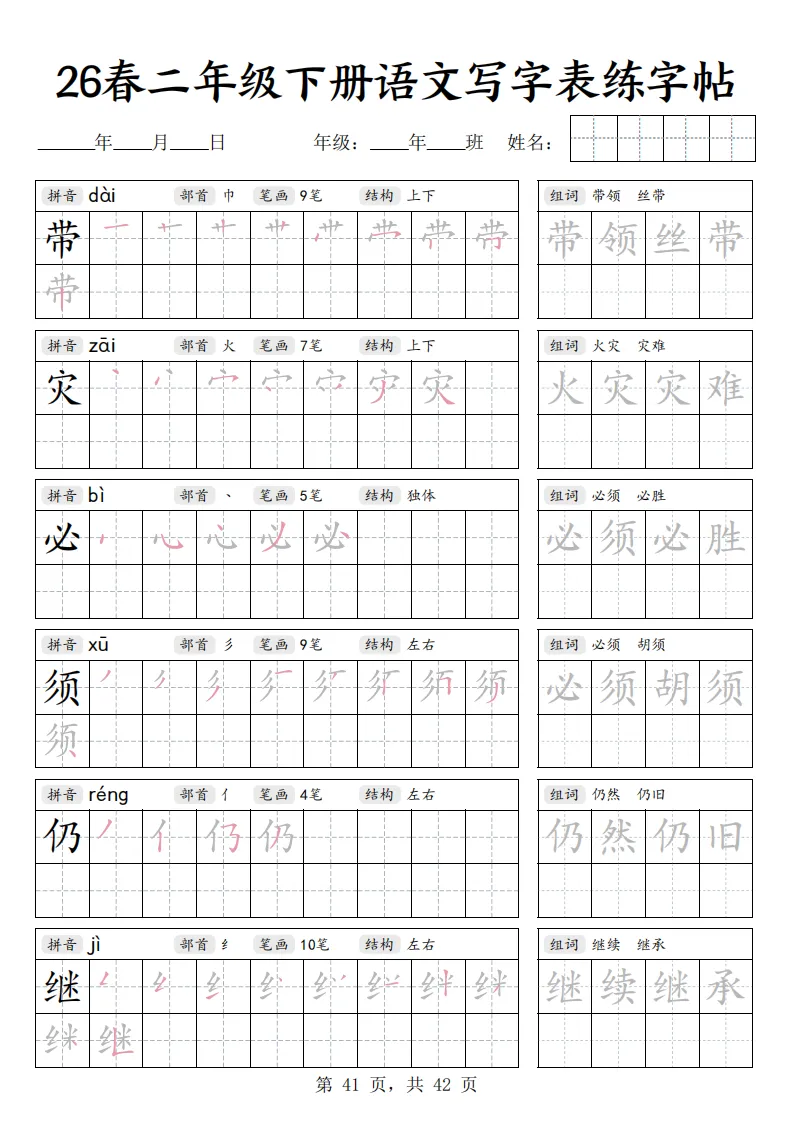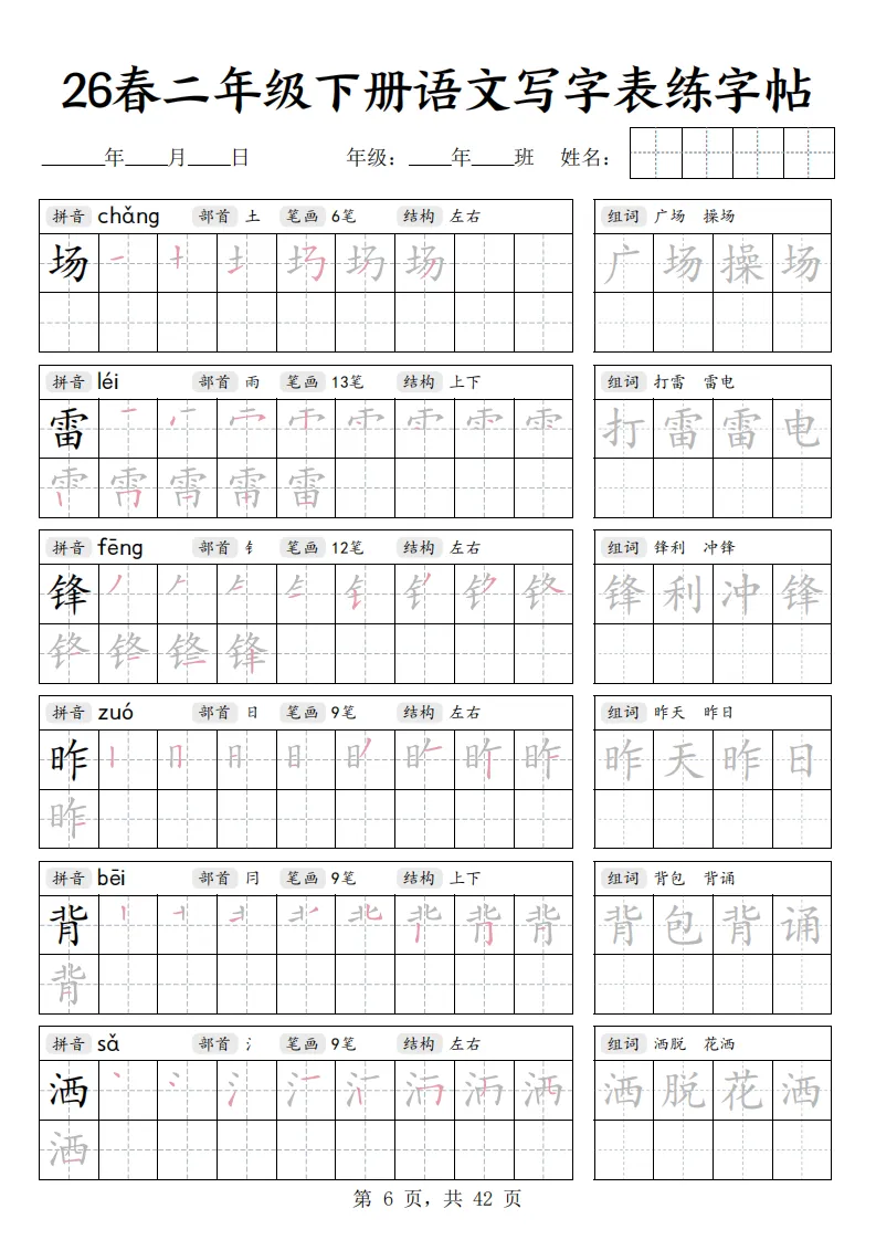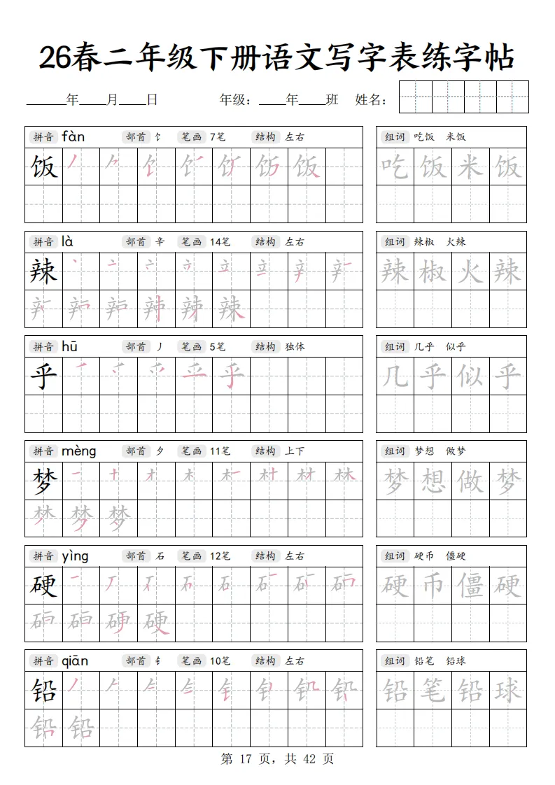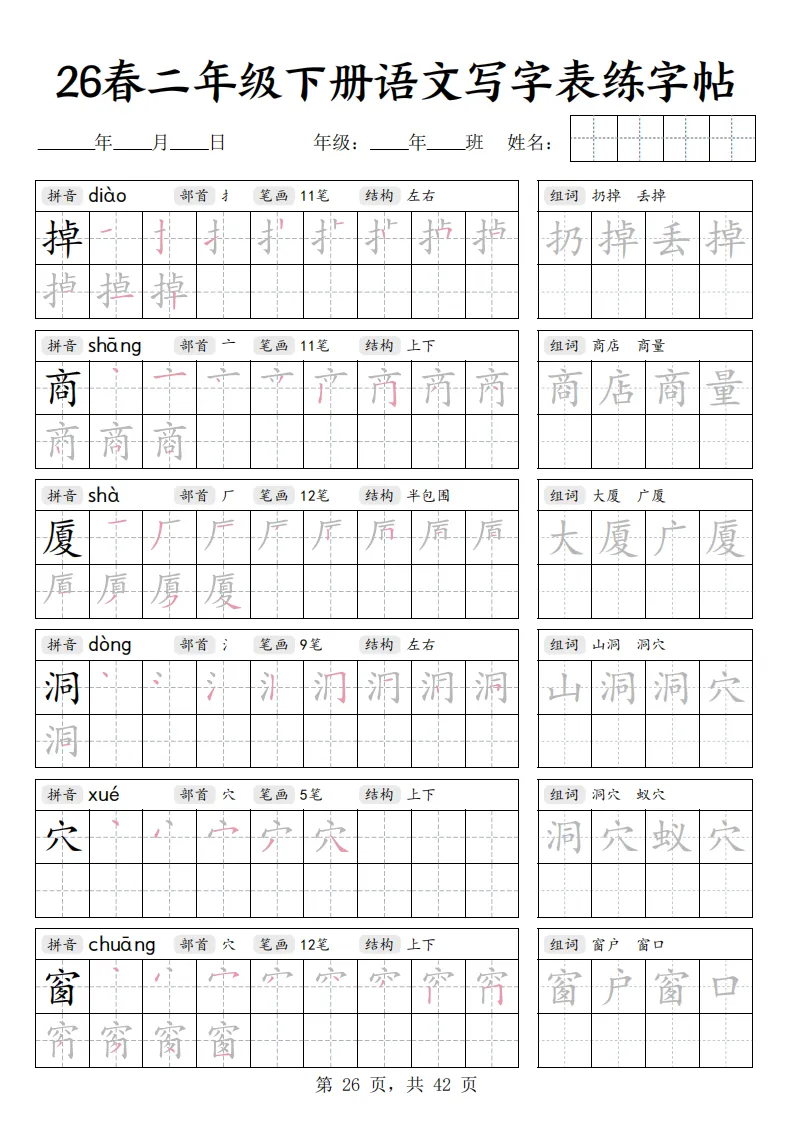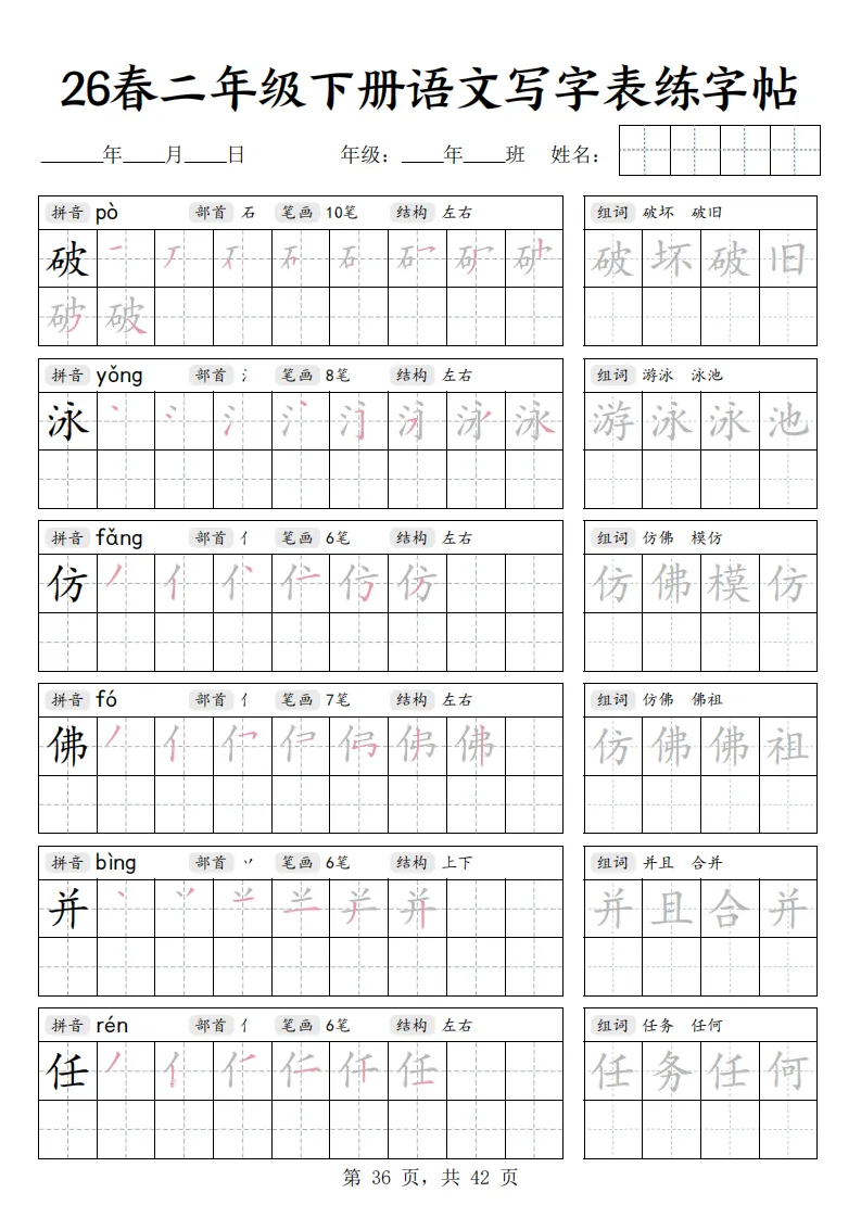 26春二年级下册语文《写字表练字帖》|电子版可打印