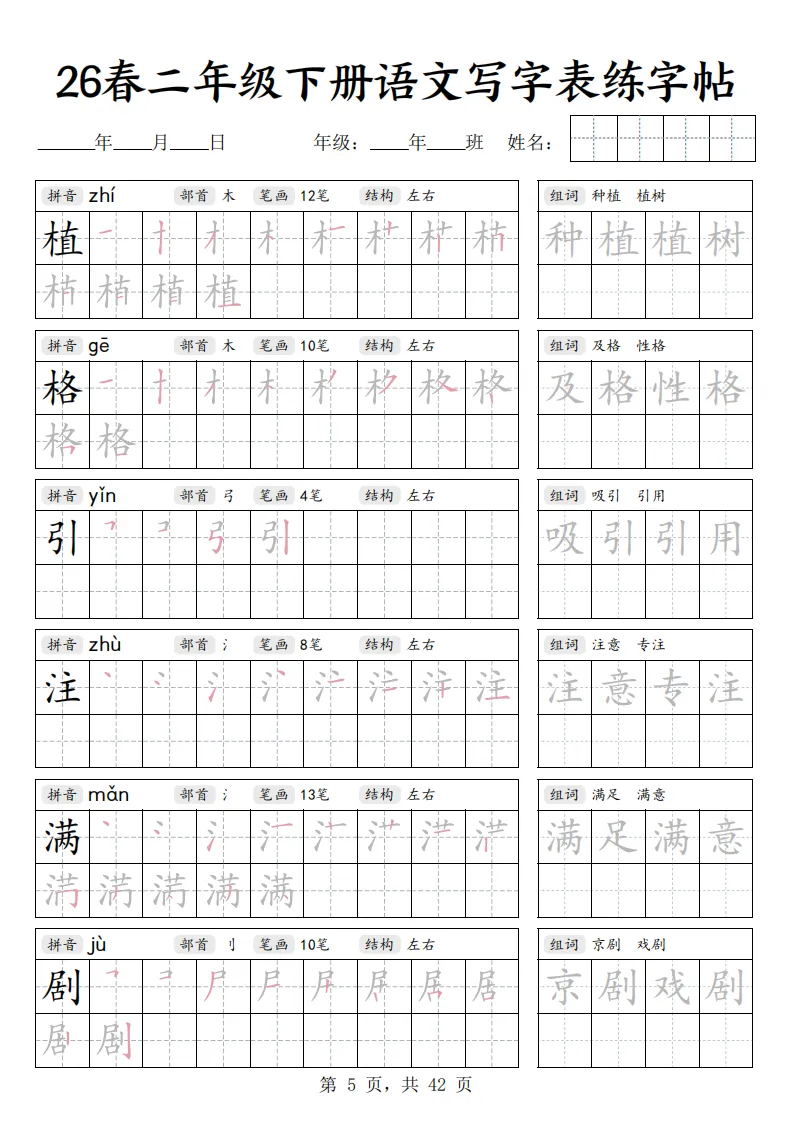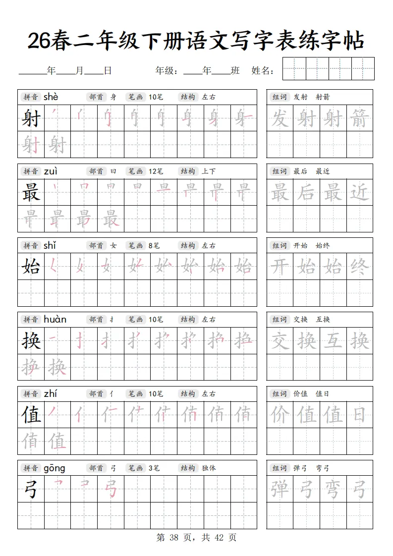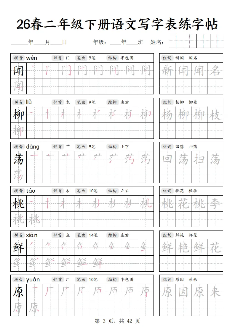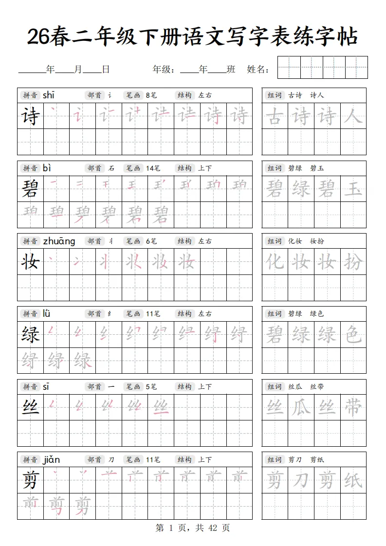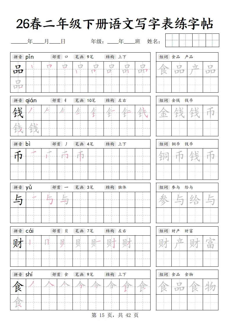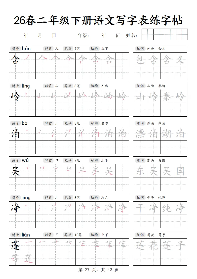 26春二年级下册语文《写字表练字帖》|电子版可打印