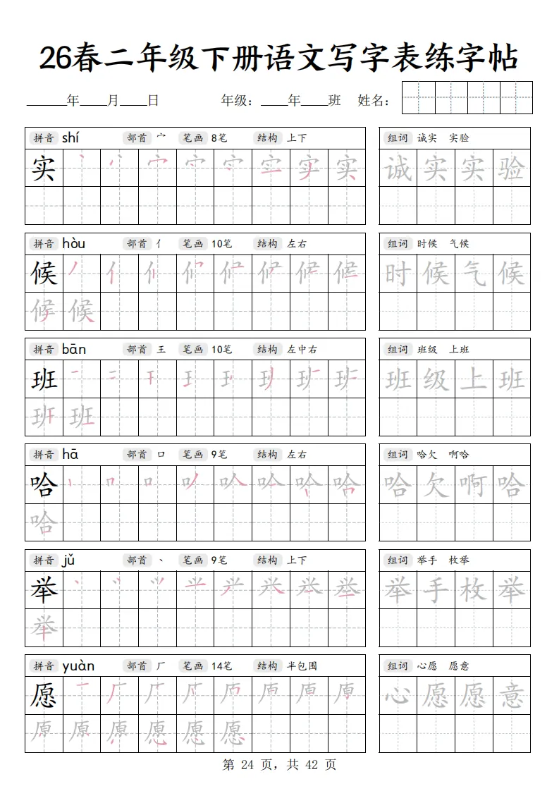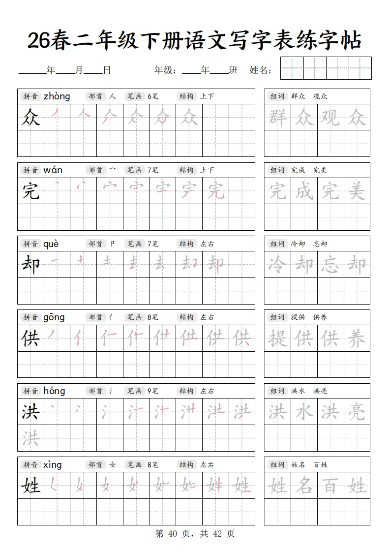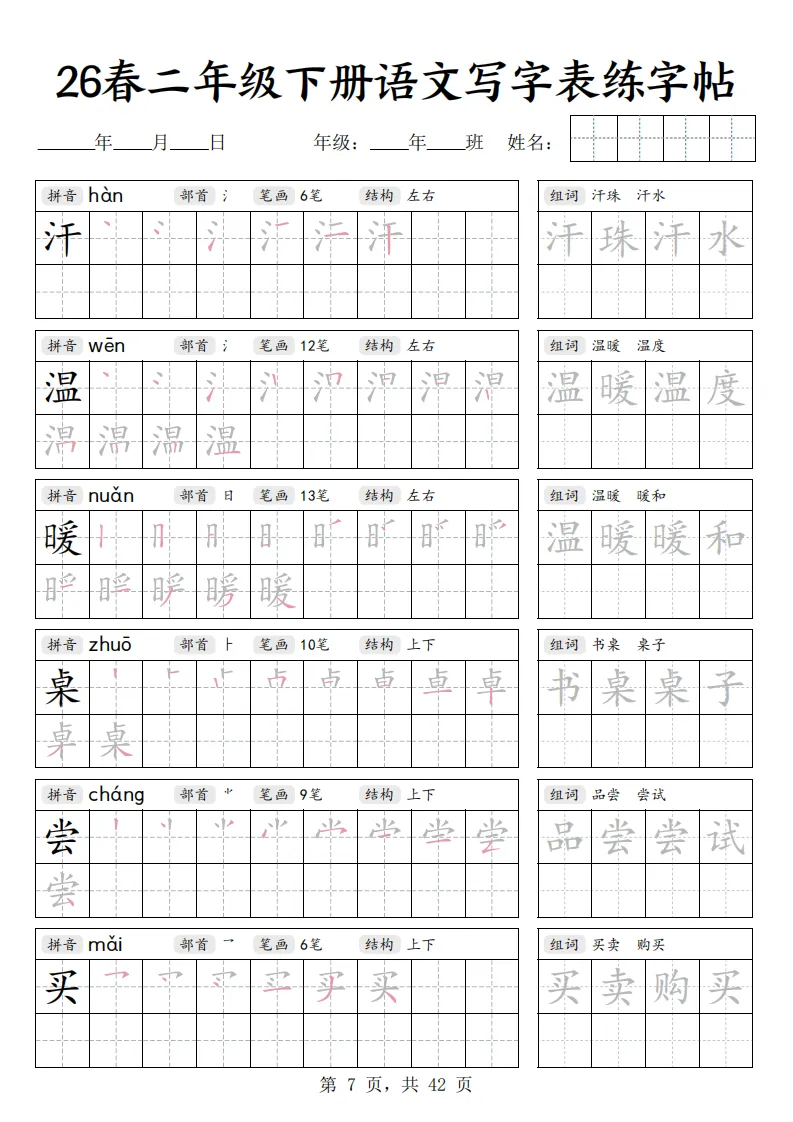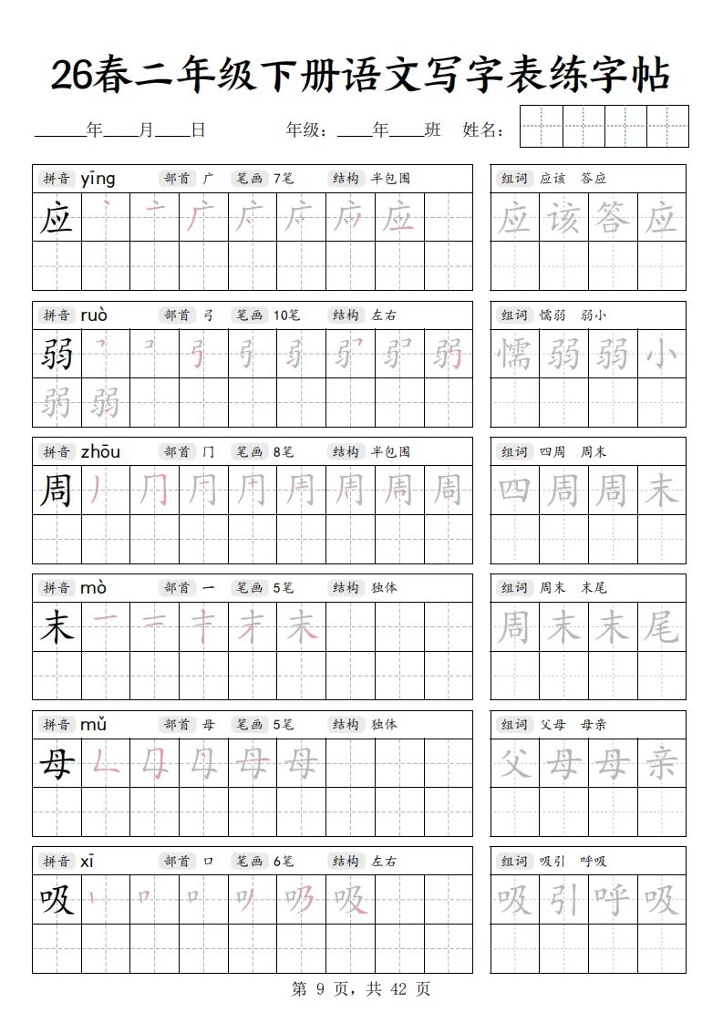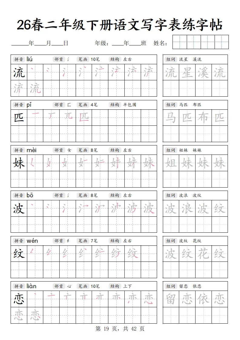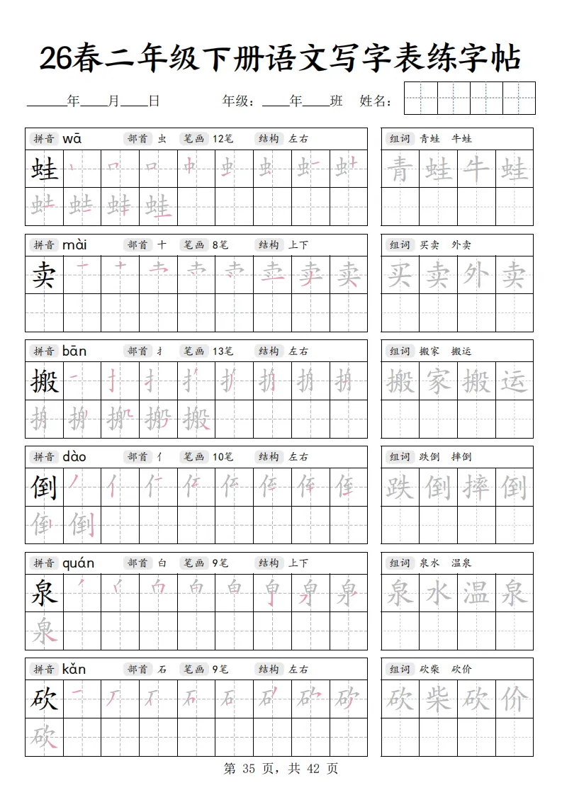 26春二年级下册语文《写字表练字帖》|电子版可打印