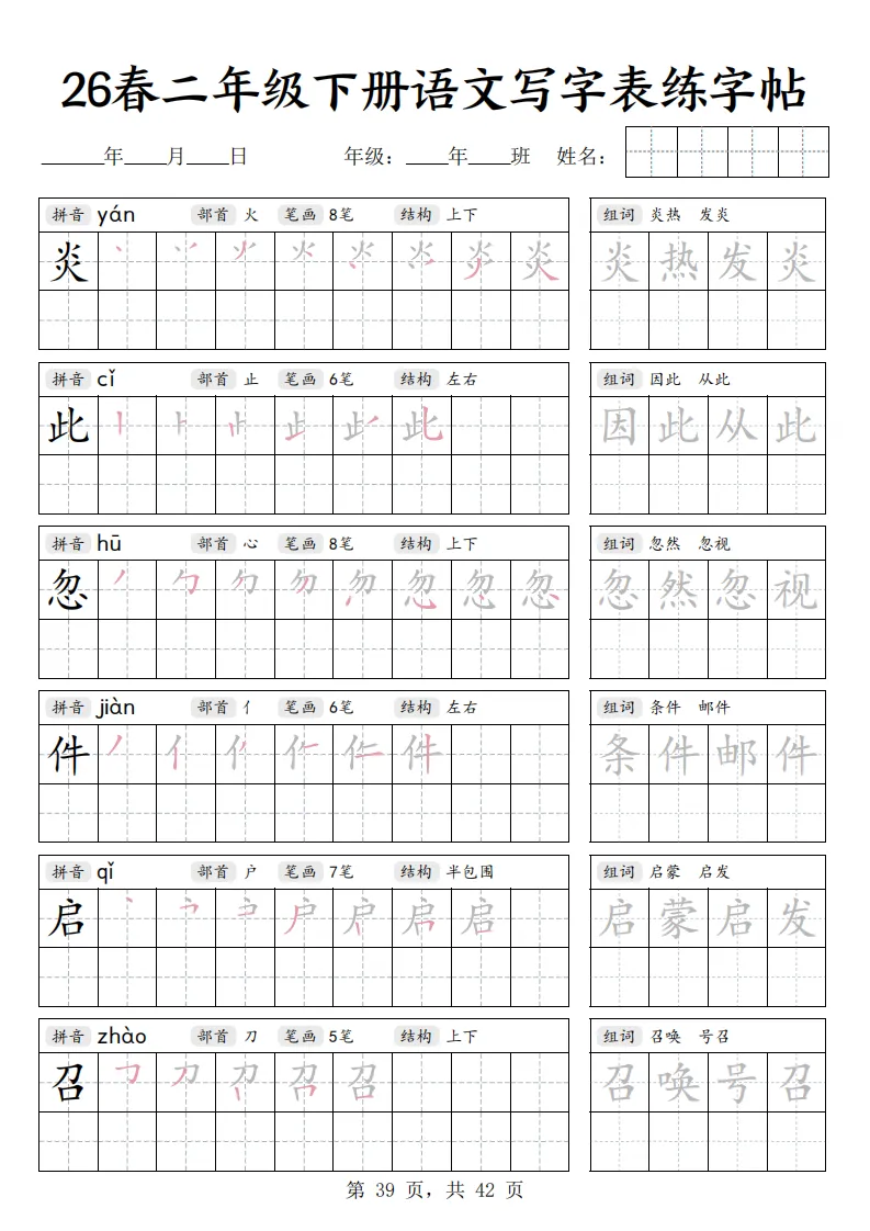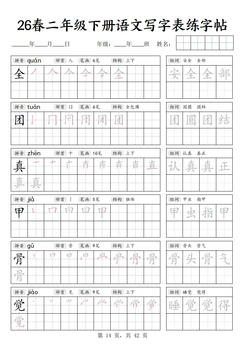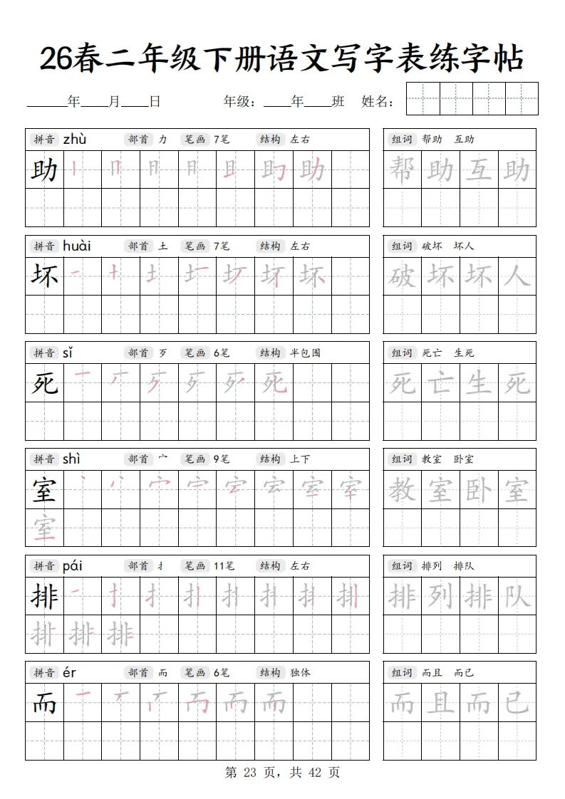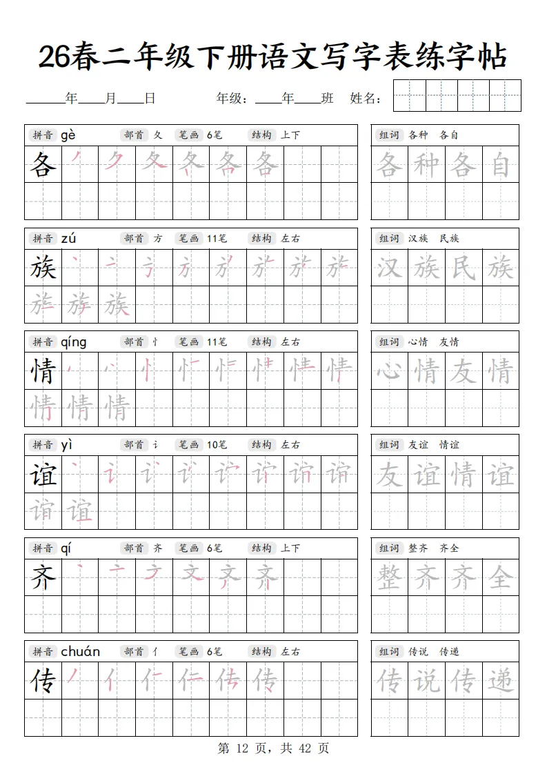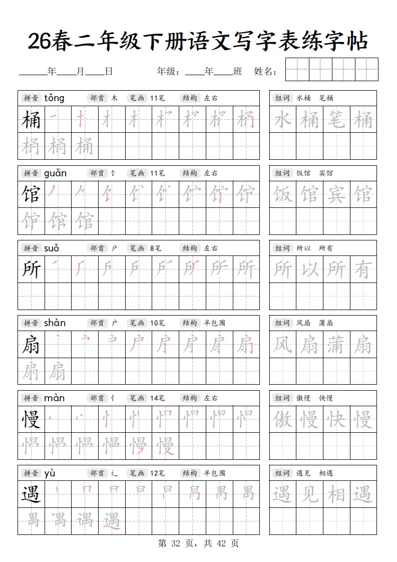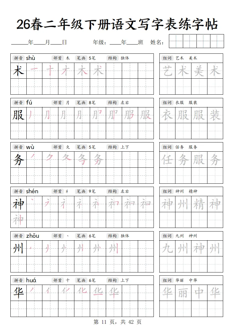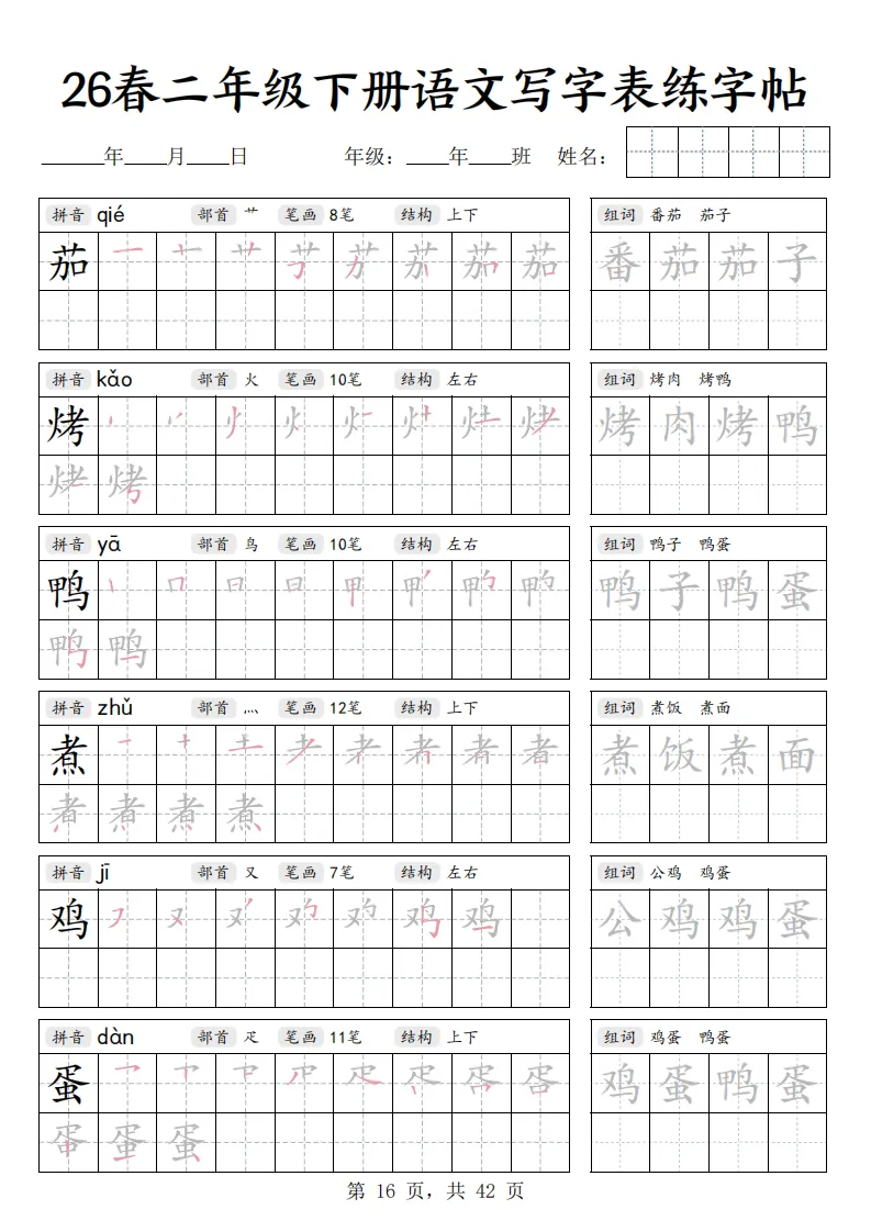 26春二年级下册语文《写字表练字帖》|电子版可打印