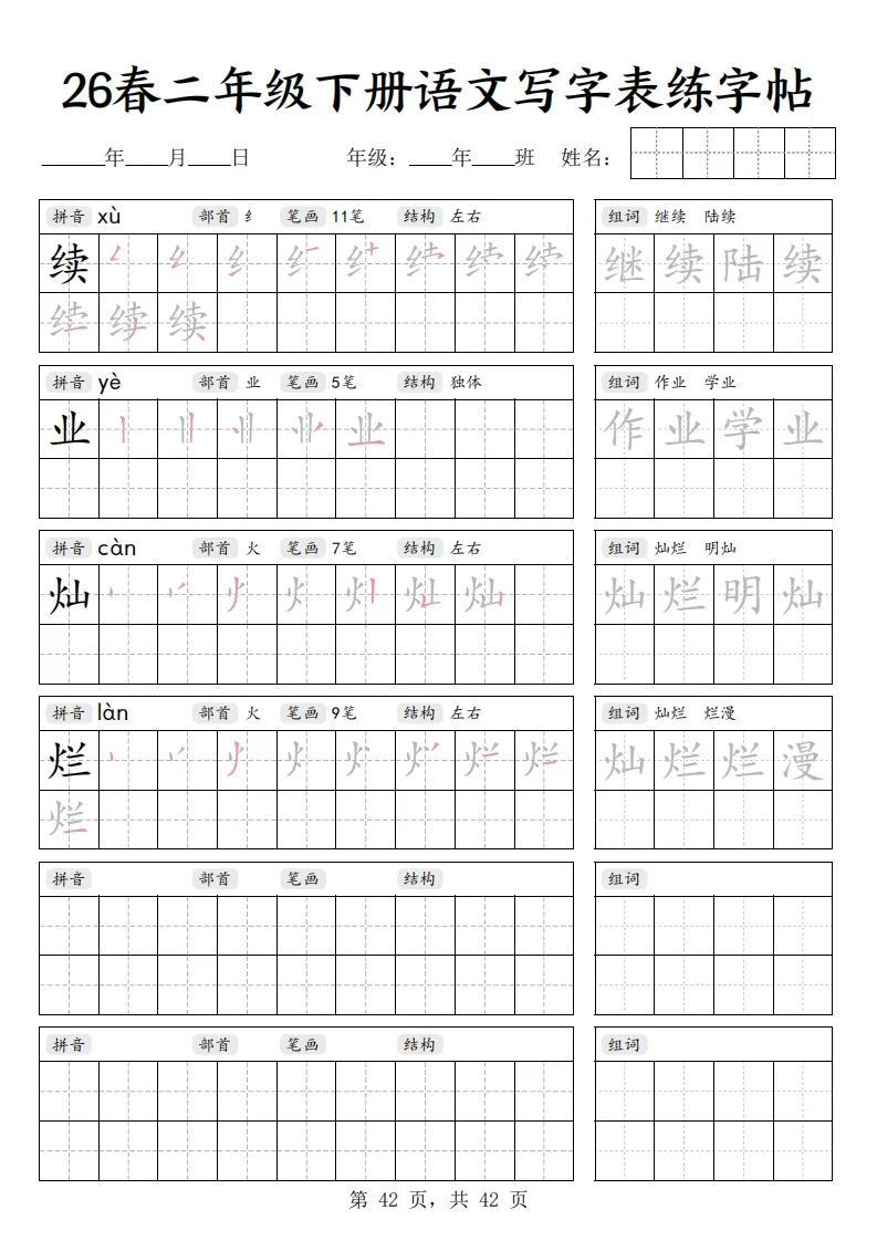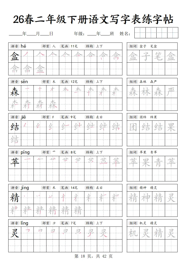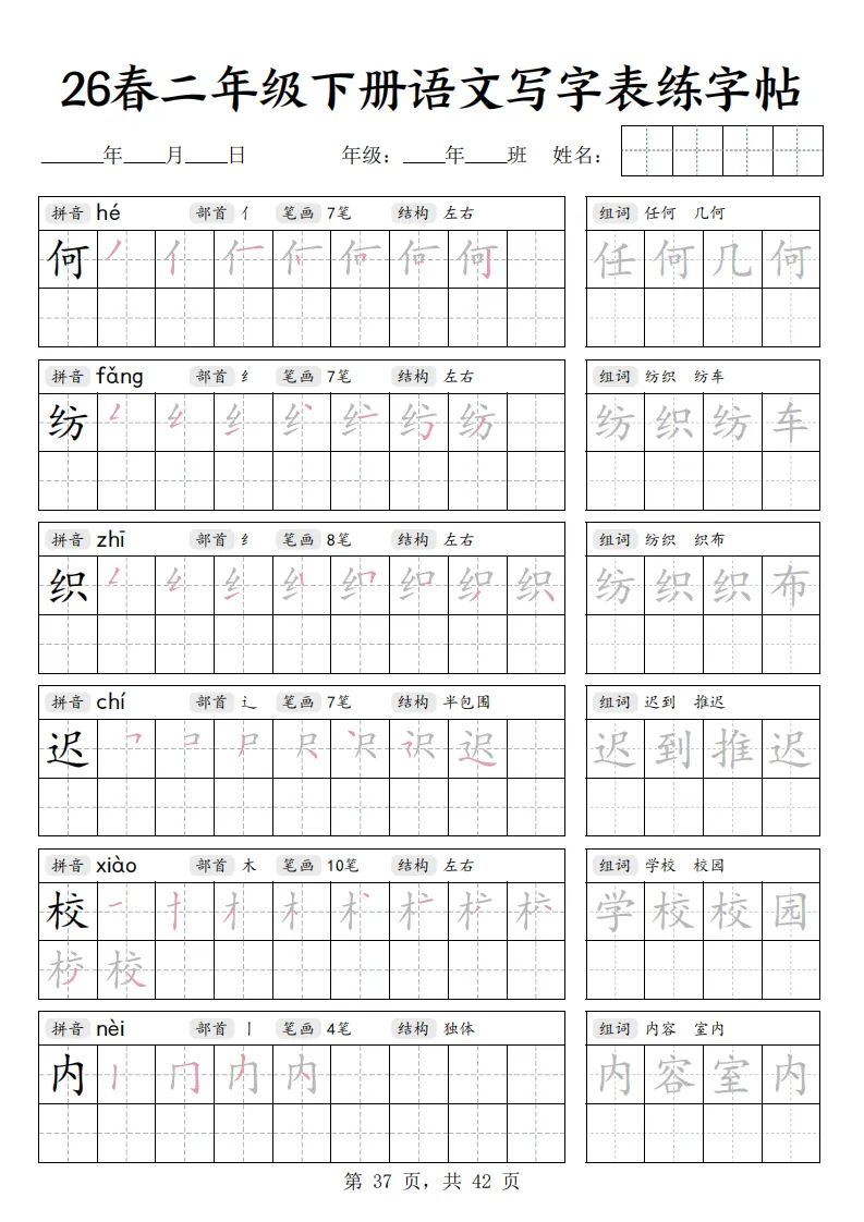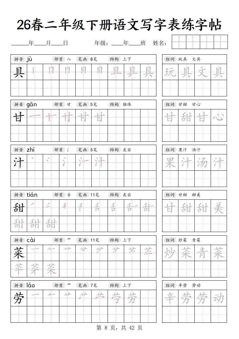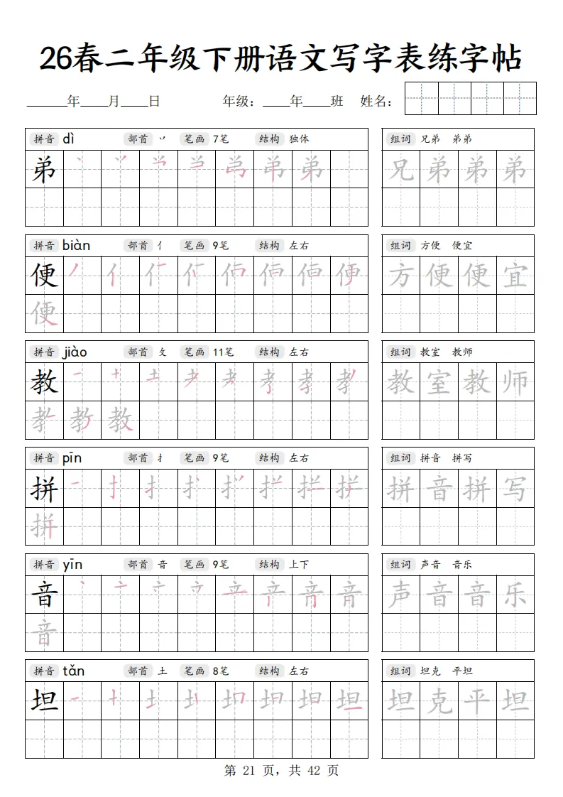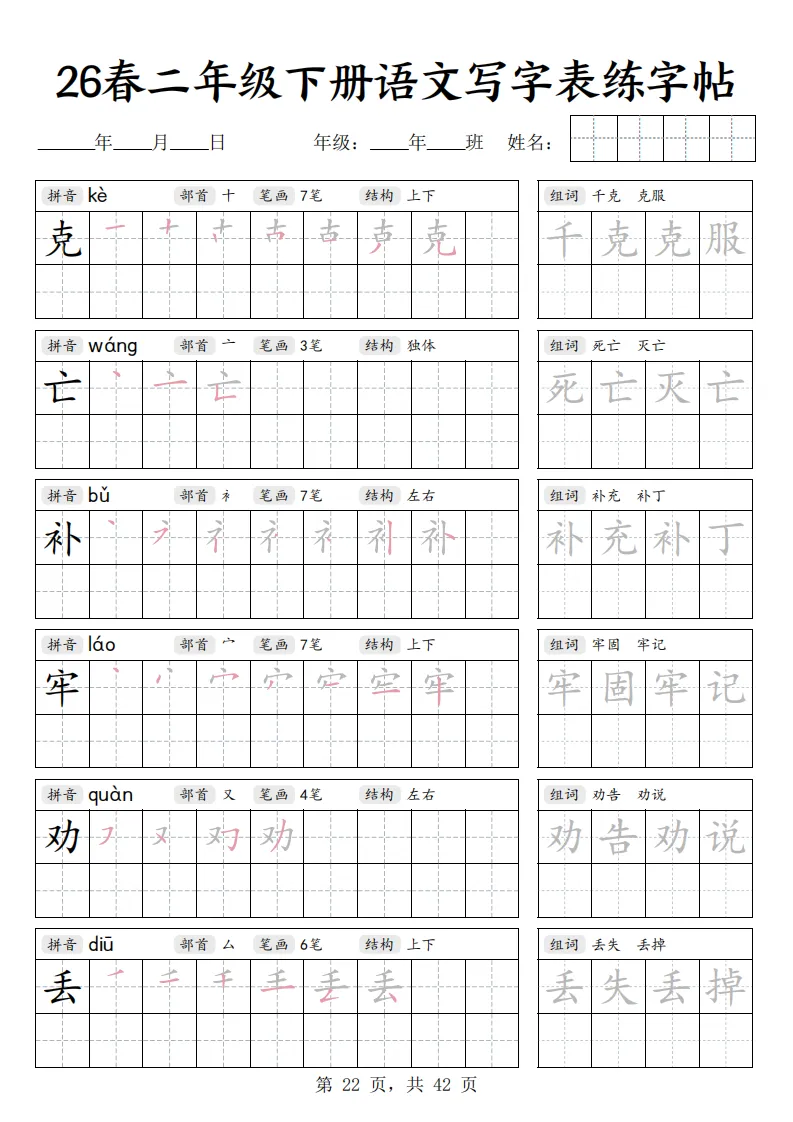 26春二年级下册语文《写字表练字帖》|电子版可打印