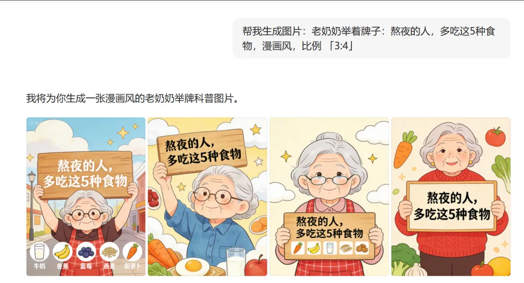 借助各类主流的AI绘画工具,你只需输入精准的指令,AI就能替你完成创作。 比如输入:“一位老奶奶举着提示牌:熬夜的人,多吃这5种食物。”