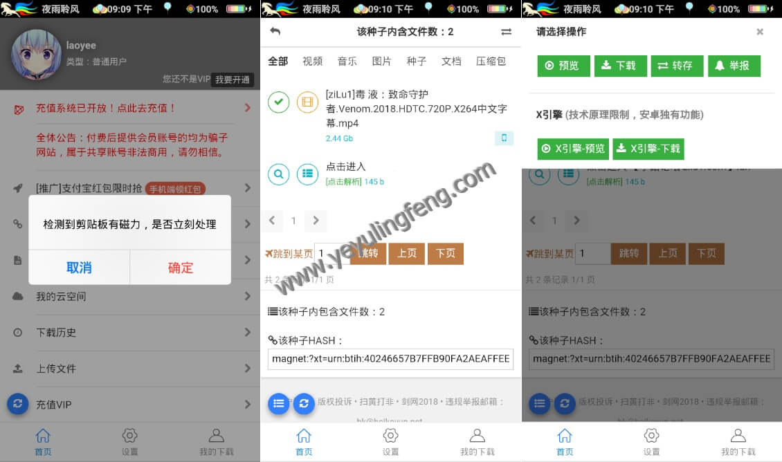 Android和iOS功能以及界面都差不多,下图以安卓环境为大家简单的测试,成功安装下载器后打开工具保持后台运行,然后就会默认监控剪切板了,一旦复制相关的磁力下载链接后,再次打开下载器便会弹出是否下载该磁力链接关联的资源请求,如果需要下载点击确认即可享受满速飙到底的下载体验。