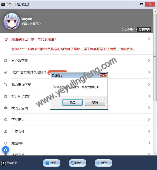 黑客下载器算是额很久以前老夜就接触过的一款下载工具了,因为当时相关工具的泛滥以至于一直被忽视,最近下载工具凉透了半边天才得以想起这款工具了。现在随着用户量的增长,已经有了相关的付费业务了,免费和用户每天可以免费下载5个不限制大小的资源,超过数量要么等明天下载要么就得需要掏口袋了了,但是我们只要反向思考一下,再重新注册一个账号会有什么奇怪的事情发生呢?疯狂暗示蓄力中……其实一天下载5个资源真的是完全足够了,那些不够用的小伙伴们身子真是铁打的?