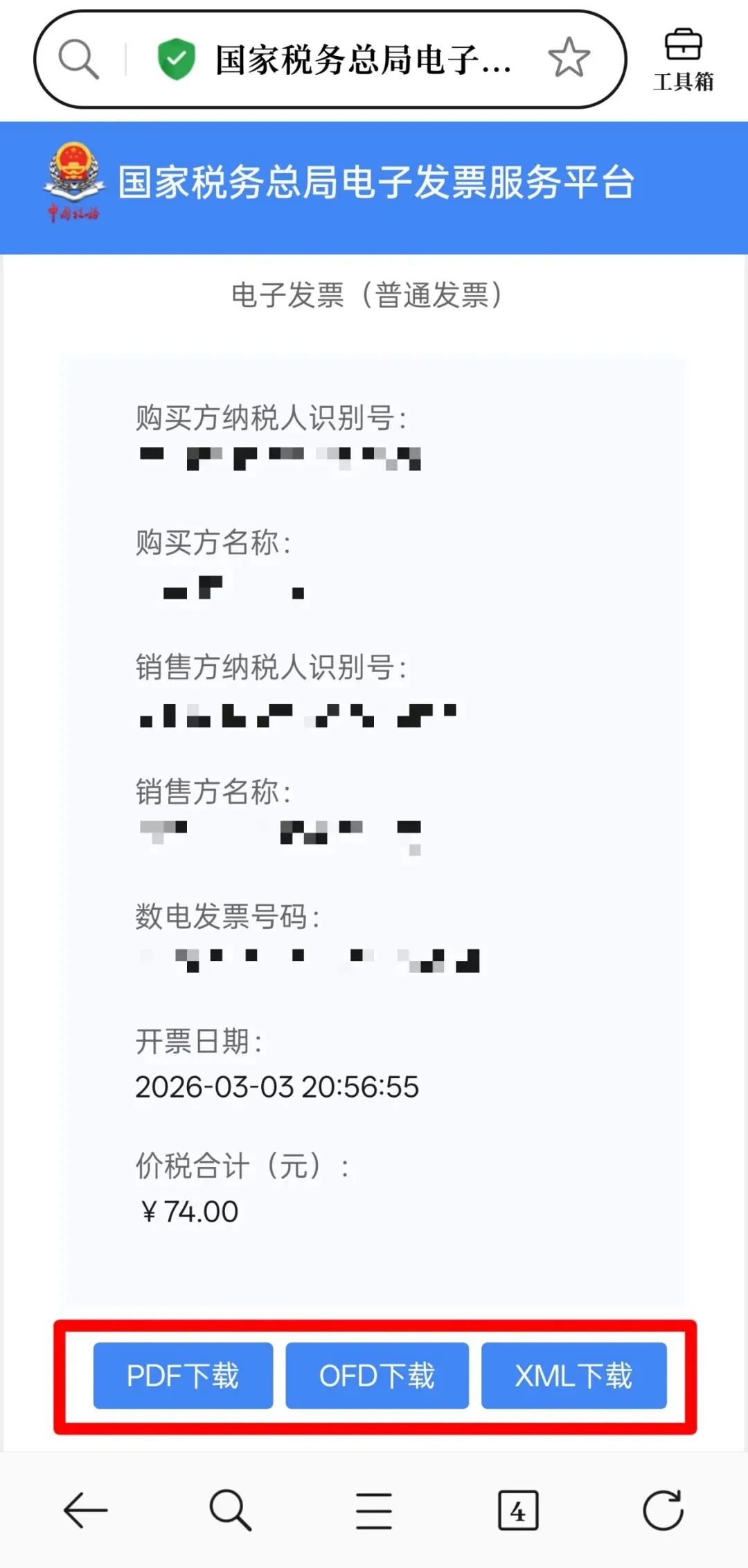 点击【下载发票】跳转到浏览器发票下载页面,支持PDF、OFD、XML下载格式。