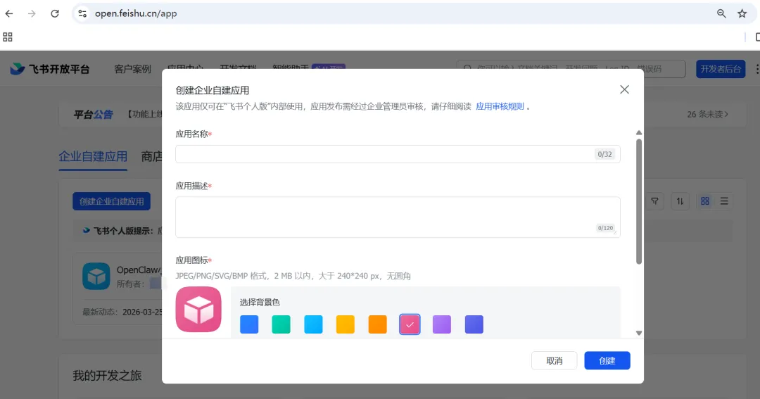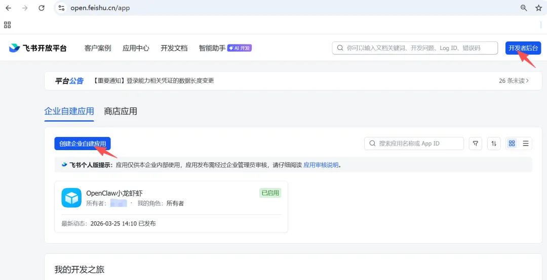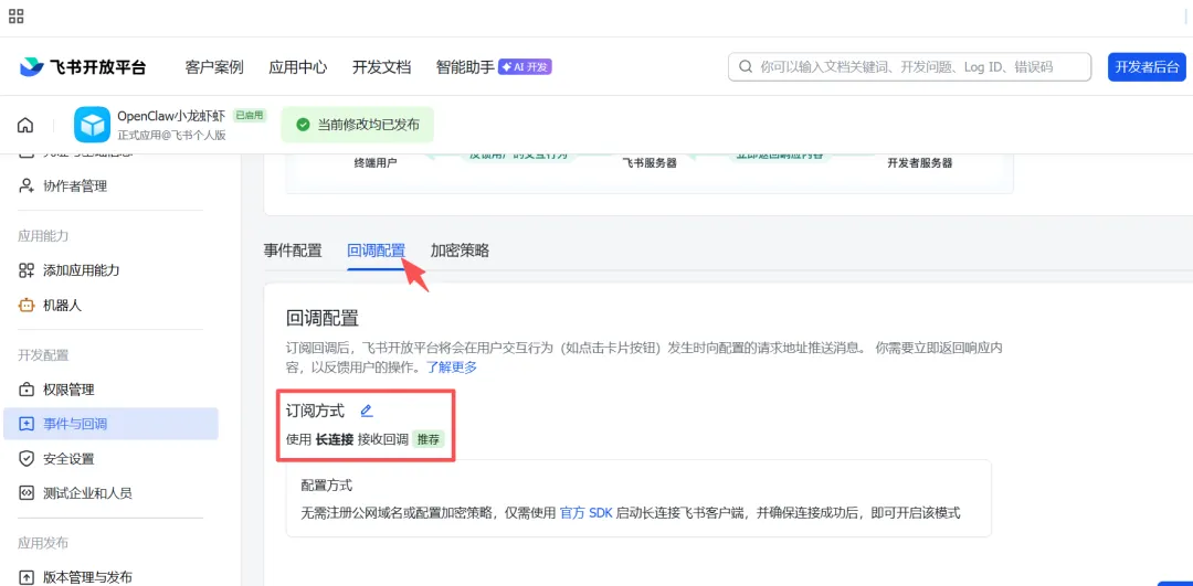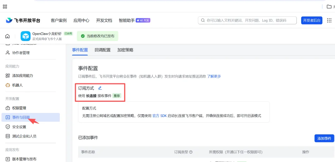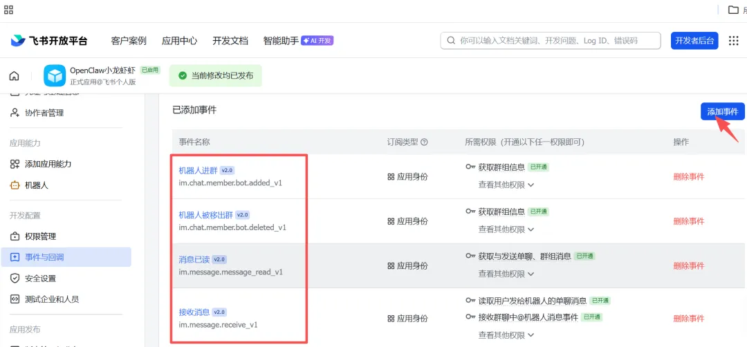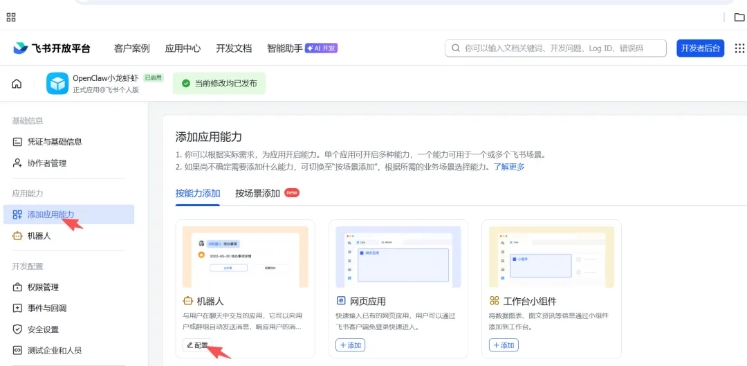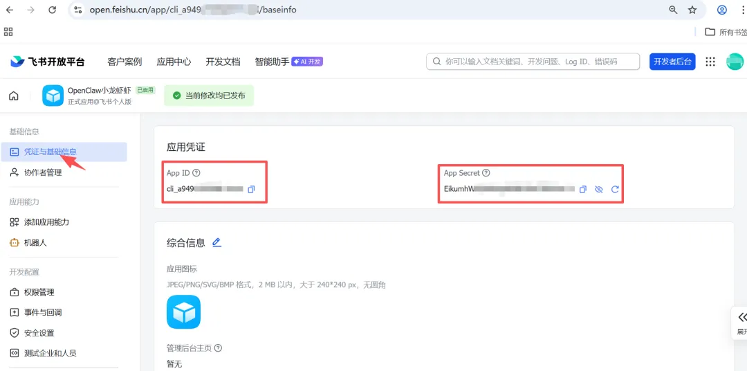 配置完成后,点击“凭证与基础信息”,把应用凭证中的APP ID和App Secret的值复制下来,后面需要用到,要配置到openclaw.json中。