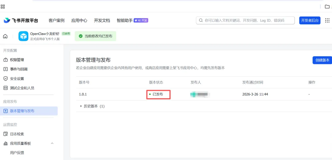 5、配置完成后,在【版本管理与发布】页面创建版本并发布。