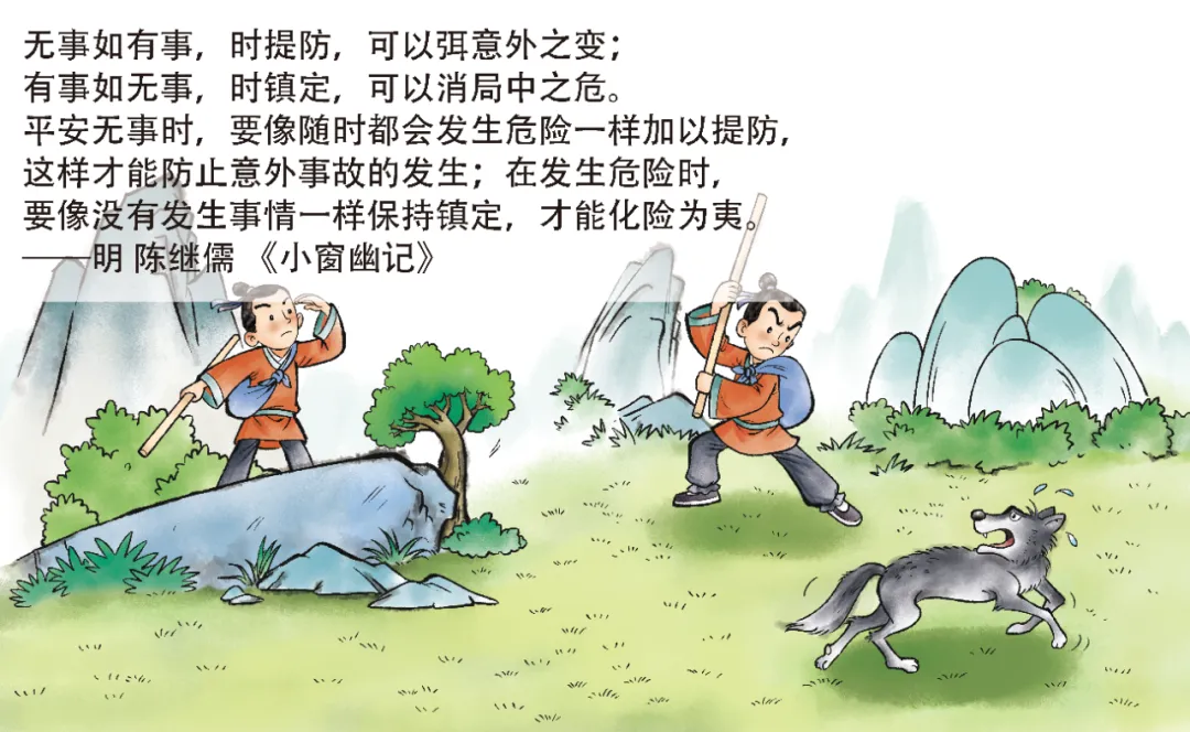 无事如有事,时提防,可以弭意外之变;有事如无事,时镇定,可以消局中之危。平安无事时,要像随时都会发生危险一样加以提防,这样才能防止意外事故的发生;在发生危险时,要像没有发生事情一样保持镇定,才能化险为夷。