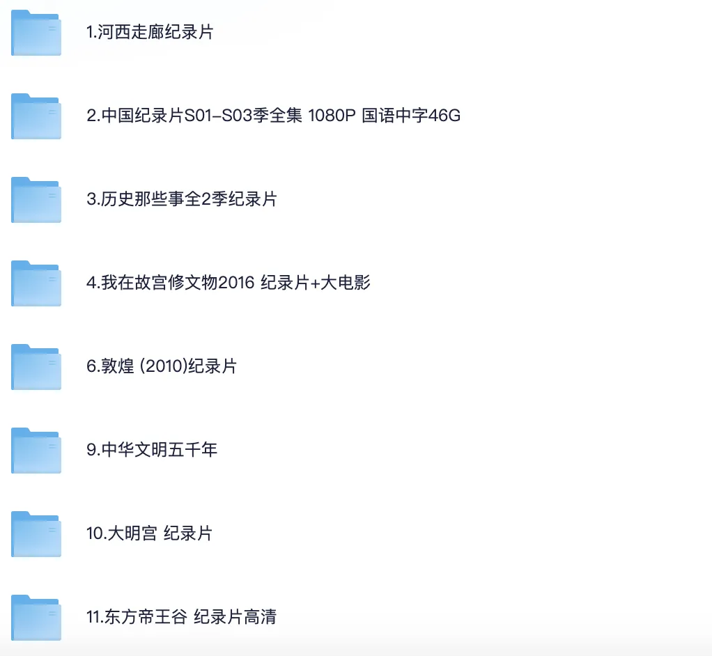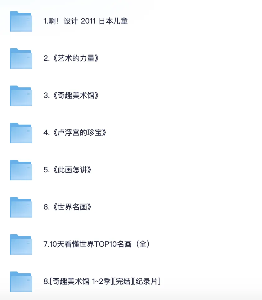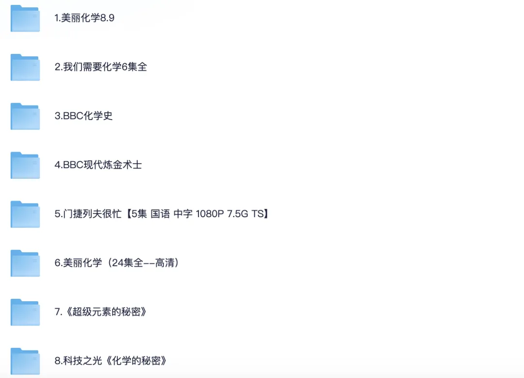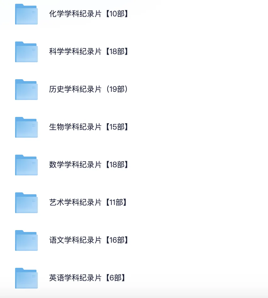 艺术学科纪录片【11部】 2.《艺术的力量》 1.啊!设计 2011 日本儿童 3.《奇趣美术馆》 4.《卢浮宫的珍宝》 5.《此画怎讲》 6.《世界名画》 7.10天看懂世界TOP10名画(全 8.[奇趣美术馆 1~2季][完结[[纪录片] 9.跟随名家脚步看懂中国名画 10.中央教授中国古代绘画通识课 11.跟随名家脚步看懂中国名画 化学学科纪录片【10部】 1.美丽化学8.9 2.我们需要化学6集全 3.BBC化学史 4.BBC现代炼金术士 5.门捷列夫很忙【5集 国语 中字 1080P 7.5G TS】 6.美丽化学 (24集全–高清) 7.《超级元素的秘密》 8.科技之光《化学的秘密》 9.物从何处来 10.PBS 物质之谜寻找新元素The.Mystery.of.Matter 科学学科纪录片【18部】 1.我的牛顿教练【6集 1080P 9.5G】 2.《超级巴斯德》 (全2季)3.阿嘟白泽·超有趣的儿童科学启蒙《这是什么》 4.《像乌鸦一样思考》 5.史上100个伟大发现 6.宇宙时空之旅(2014) 7.DK儿童百科全书 动画版 8.《平博士密码》 9.造物小百科 10.《科学实验》 11.阿基米德的秘密 Infnite Secrets The Genius of Archimedes(2003) 12.科学的力量 13.熊猫博士看世界 26大专题 230集儿童科普视频 15.斗转星移(52集天文科普全-高清) 17.探索·好奇少年的双语科17.学世界-60集科学启蒙视频+音频+卡片 18.儿童科普纪录片《如果我是一只动物》 历史学科纪录片【19部】 1.河西走廊纪录片 2.中国纪录片S01-S03季全集 1080P 国语中字46G 3.历史那些事全2季纪录片 4.我在故宫修文物2016 纪录片+大电影 6.敦煌(2010)纪录片 9.中华文明五千年 10.大明宫 纪录片 11.东方帝王谷 纪录片高清 13.何以中国 4K高码收藏版 豆瓣9.1高分!! 14.漫游全球博物馆 100件文物里的文明故事【完结】 15.假日博物馆-博物馆里的中国通史1-7季 16.CCTV纪录片 圆明园 720P 三集全 17.爆笑中国历史1-4(80集完结) 18.从秦始皇到汉武帝(全6集) 19.风云战国之枭雄 纪录片 共7集 生物学科纪录片【15部) 1.BBC.生命 2.绿色星球(2022) 4K REMUX(蓝光 原盘) 3.BBC.王朝 4.动物界的爱因斯坦 5.工作细胞系列合集 6.微观小世界 7.如果我是一只动物 儿童科普纪录片高清 8.未至之境 9.与恐龙同行 10.水果传 11.儿童科普纪录片《奇妙的动物》全系列 12.小小世界 tiny world 中字幕 经典纪录片 13.动物世界纪录片《萌宠成长记 Too Cute!》1-3季全 14.儿童科普动画《奇妙的世界》120集全 15.企鹅群里有特务 16.奇趣自然博物馆 数学学科纪录片【18部】 1.数字积木 Numberblocks 2《数字虫》 3.用动画学奥数 4.怪物数学小分队-幼儿数学启蒙动画 5.佩格和小猫.Peg+Cat.适合4-8岁.超清1080P 6.《快乐的数字》 7.《被数学选中的人》 8.数学的故事 9.数学漫步之旅【2021】】【法国】9.5分 10.《解码数学》 11.《概率知多少》 12.《数学漫步》 13.逻辑的乐趣 14.寻找隐藏的维度 15.大数据时代.2013 16.统计的乐趣 17.数学大迷思 18.约翰·纳什伟大的疯狂 语文学科纪录片【16部】 1.中国唱诗班(2017)1080P.全6集 2.中国传统文化双语动画纪录片(100集全) 3.大国工匠 4.字从遇见你(2022)25集 国语 中字 1080P MP4】纪录片 5.书简阅中国(2021)1080P 6.中国古诗词大会(1-6季) 7.第三极 8.典籍里的中国 全二季 4K 9.一本书一座城(全两季) 11.汉字宫1-4部 576集 视频+识字卡和教材 12.千古风流人物 4季全|4K 13.带着唐诗去旅行 14.史诗级纪录片《中国》1-3季全 15.唐之韵–豆瓣9.2分,影视版唐诗三百首 16.央视纪录片《宋之韵》全20集(超清版)1080P [8.6G] 英语学科纪录片【6部】 1.王冠201历史传记(全6季) 2.糟糕的历史 3.坐着火车游欧洲 4.我们的星球 5.四季中国–中英字幕纪录片(24集全) 6.你好,中国–中英字幕(100集全)–英语启蒙学习 7《见物能聊》 PDF+视频+音频资源(一套火爆全网的某平台付费英语启蒙神器 |