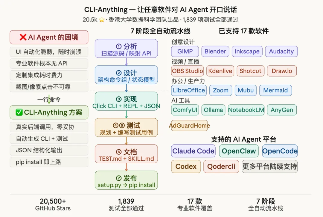 CLI-Anything 正在填补这个空白——不是重写软件,不是绕过软件,而是在人类工具和 AI Agent 之间建立一座桥梁。