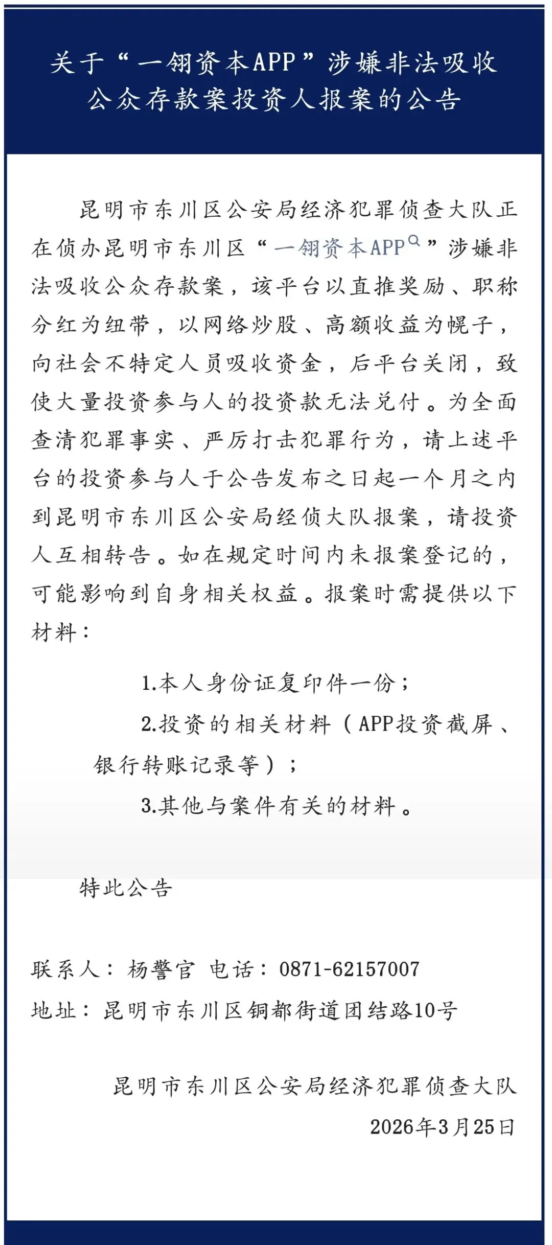 2026年3月25日,昆明市东川区公安局对外发布了关于“一翎资本APP”涉嫌非法吸收公众存款案投资人报案的公告。具体如下: