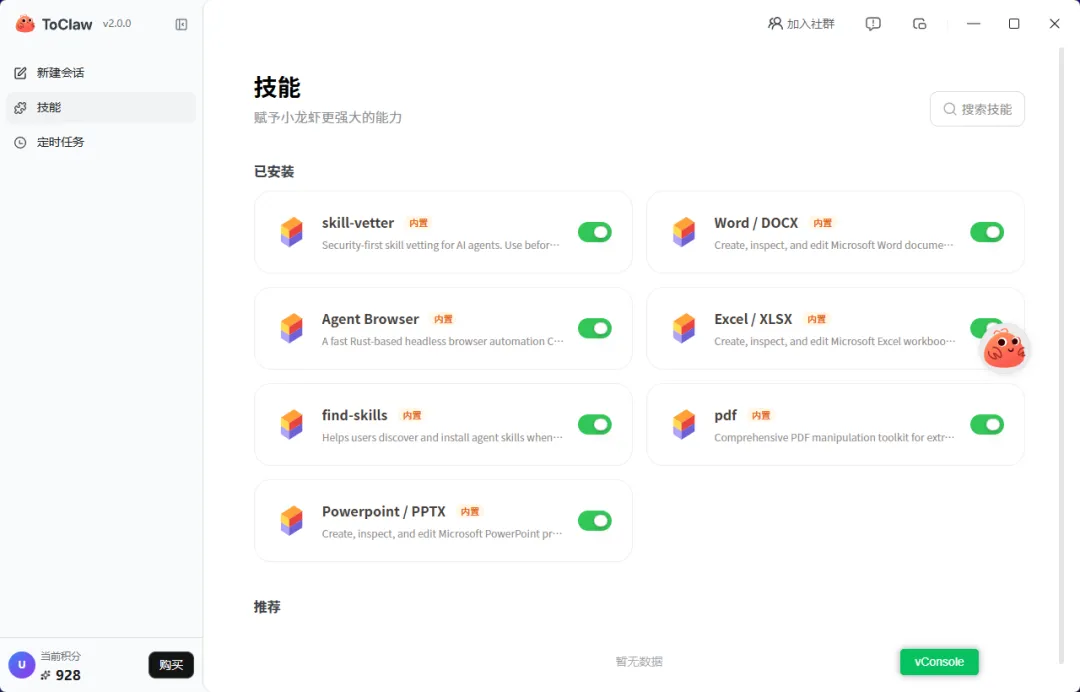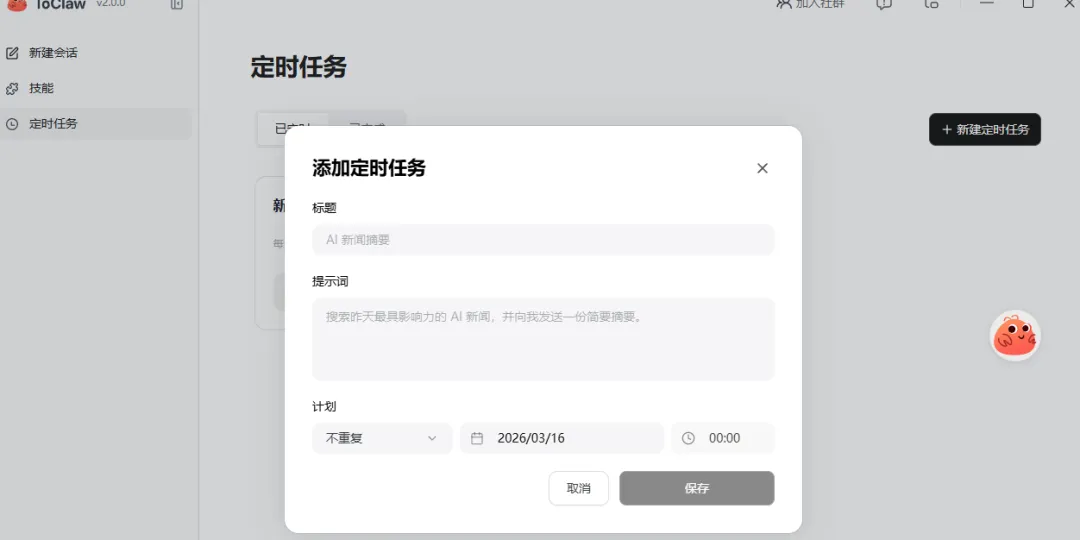 因为数字助理最重要的,不是一次回答得多漂亮,而是它能不能长期待命、反复接活。ToClaw 已经不只是一个临时会话工具,它开始具备几个很像“常驻助手”的特征: