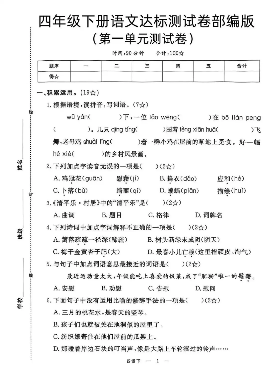 2026 年春季最新版四年级下册语文第一单元测试卷,整整 3 套,全部带详细答案,直接打印就能用