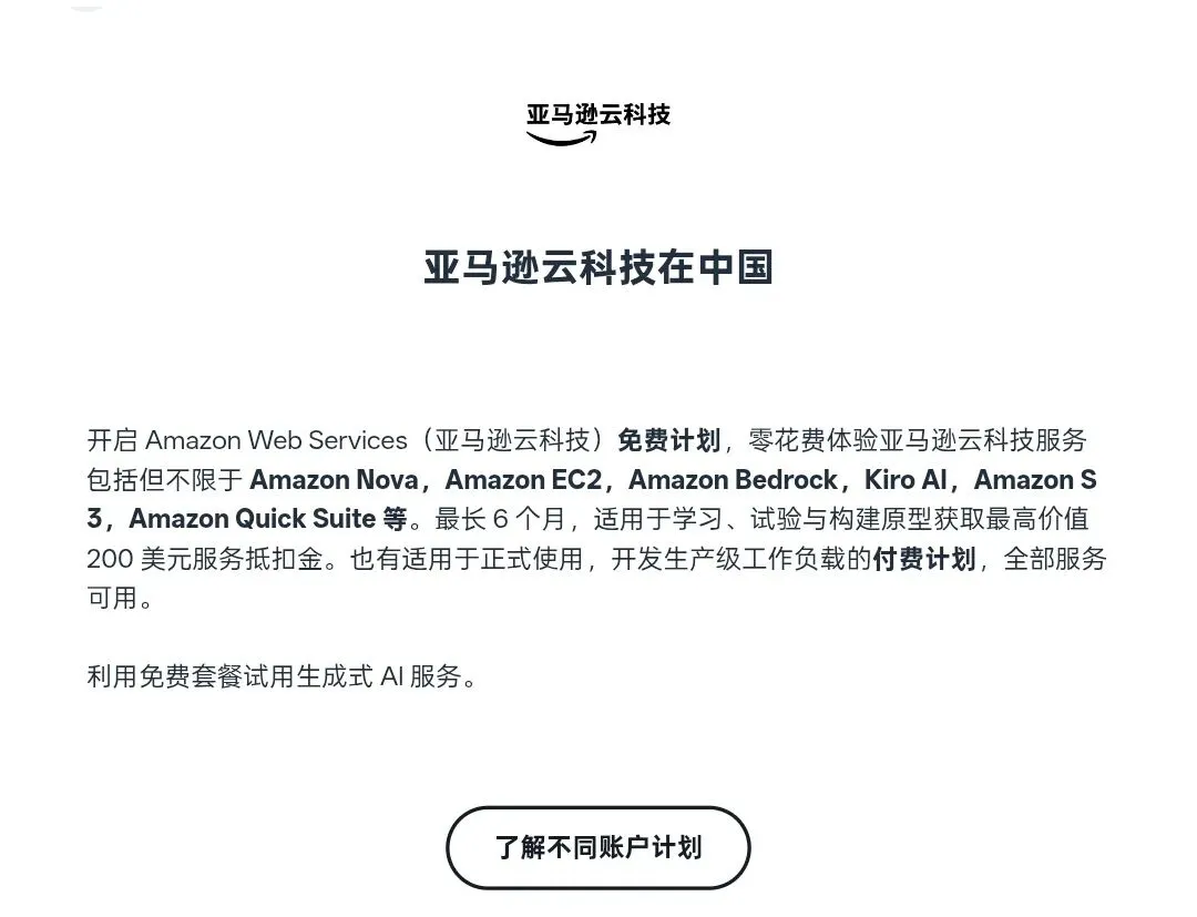 ps: 亚马逊AWS官网有个免费计划,如果你有信用卡的话可以去申请一下,新注册用户送100美金,做五个任务最多可获得200美金,可以抵扣kiro订阅套餐,注意不要选中国区,要会”魔法”你懂的!感兴趣的可以自己搜一下,网上应该有很多教程,然后注意不要去设置组织多用户,会自动升级成付费套餐抵扣金失效,我当时就是误操作浪费了这个机会。。。