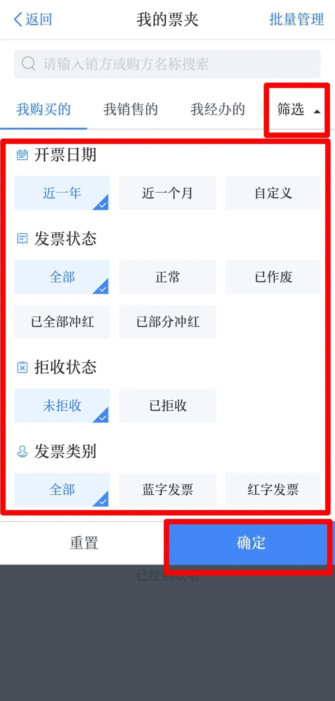 3.发票较多时,点击右上角【筛选】,可自行设置开票日期、发票状态、发票类别等筛选条件,设置完毕点击【确定】,系统将展示符合筛选条件的发票。