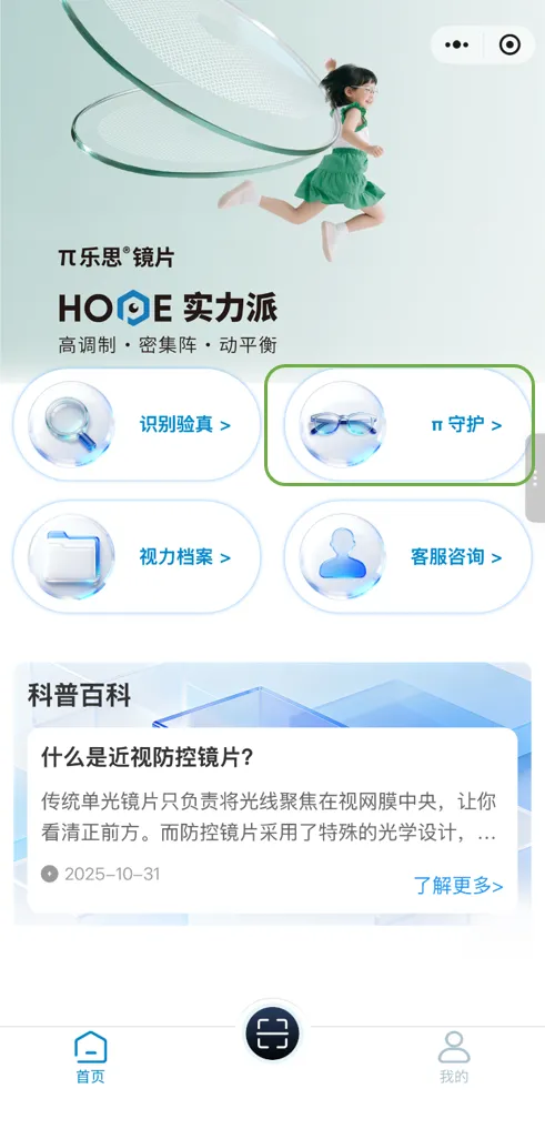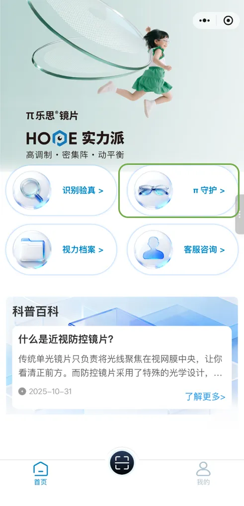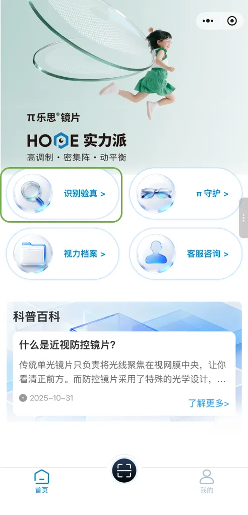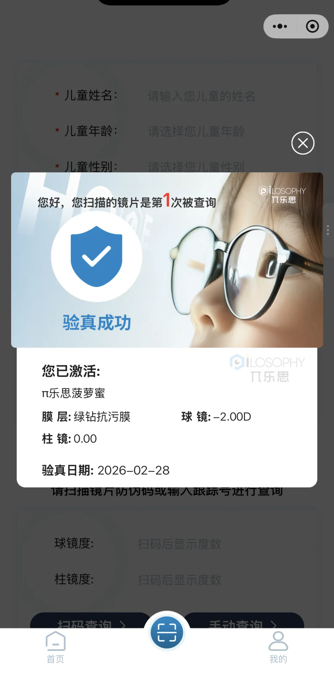 每一副π乐思®镜片背后都有防伪二维码,取镜后,可在「π乐思」小程序(见文末)扫码查询: