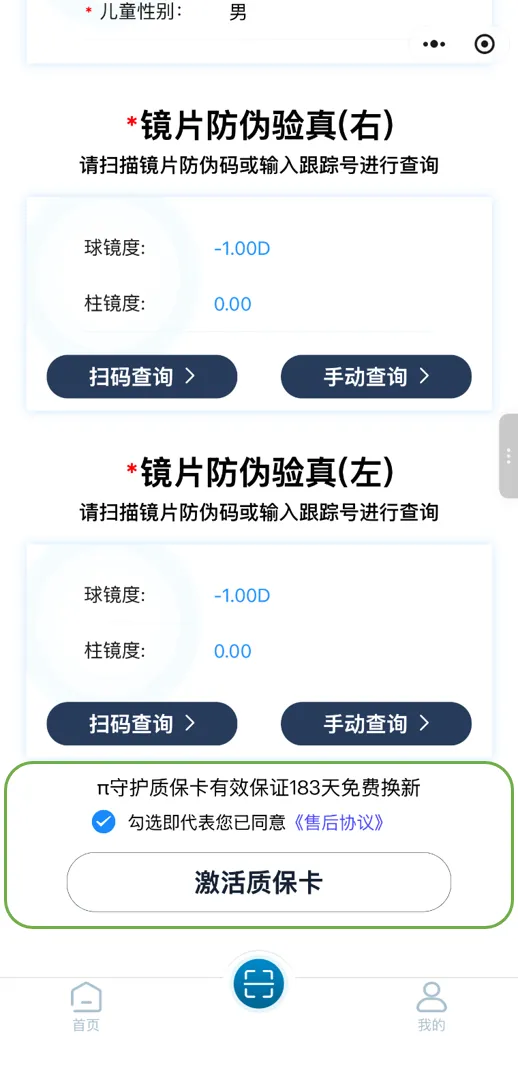 镜片验真完成后,请立即激活「π守护」质保卡,保障即时生效。如自镜片包装袋所示日期起超出30天未激活,将视为自动放弃该项权益。