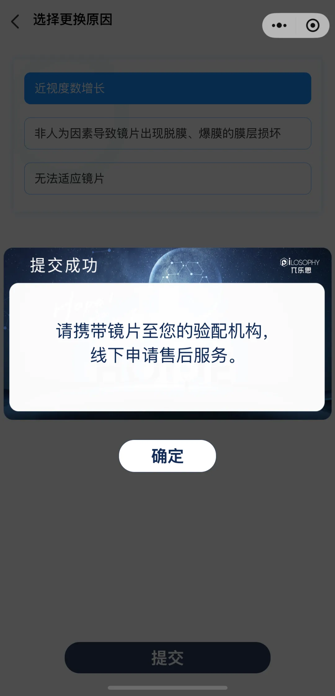 如需更换镜片,可以在小程序「π守护」页面提交更换申请。操作步骤(详见后图):